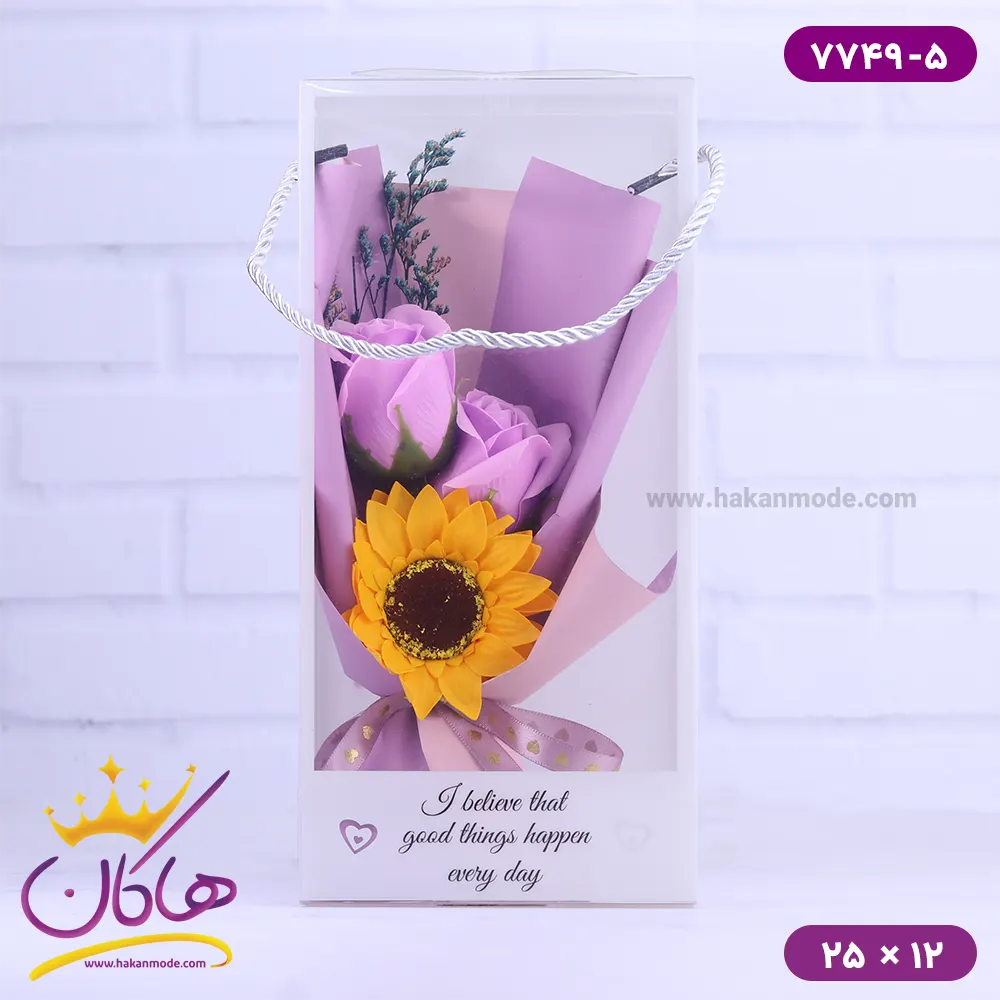 خرید و قیمت بگ دسته گل رز بنفش و آفتاب گردان 7749/5 خرید باکس گل کیفی برای افرادی که علاقهمند