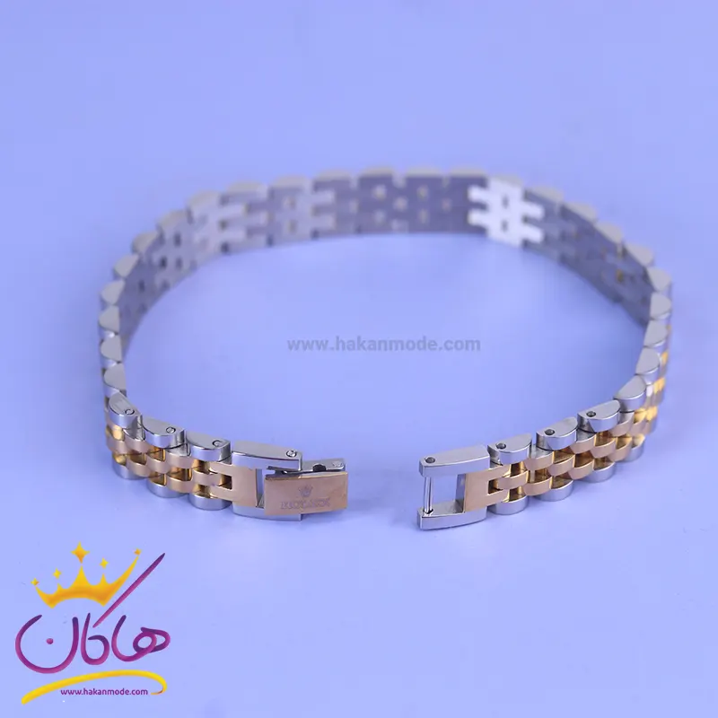 خرید دستبند مردانه رولکس باریک نقره ای طلایی st 41070 دستبند رولکس نقره ای طلایی استنلس استیل رنگ ثابت و
