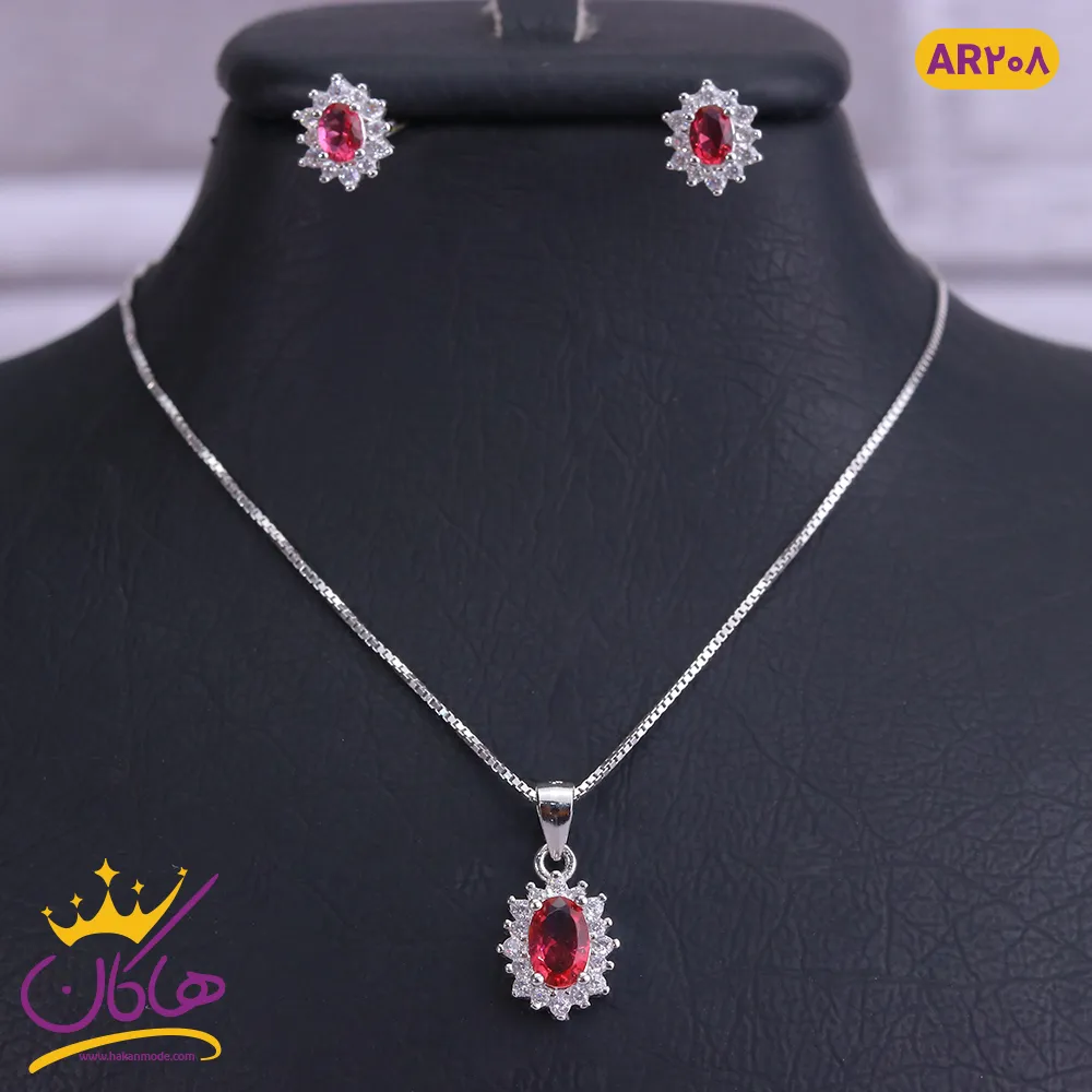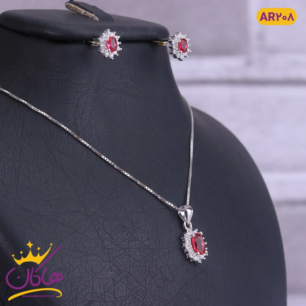 نیم ست نقره خورشیدی بیضی نگین قرمز | AR 208