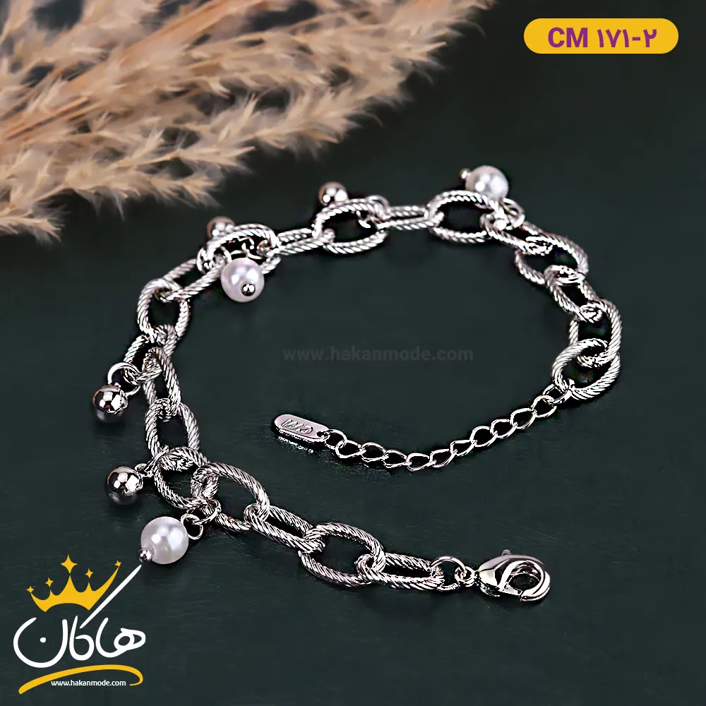 خرید دستبند استیل زنانه آویز گوی و مروارید با بهترین قیمت دستبند استیل زنانه آویز دار، طرحی شلوغ و جذاب