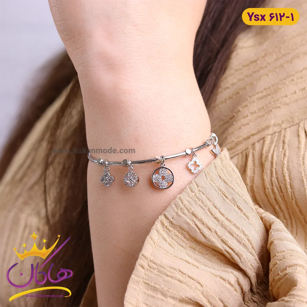 دستبند النگویی استیل زنانه آویز دار نقره ای | ysx612/1