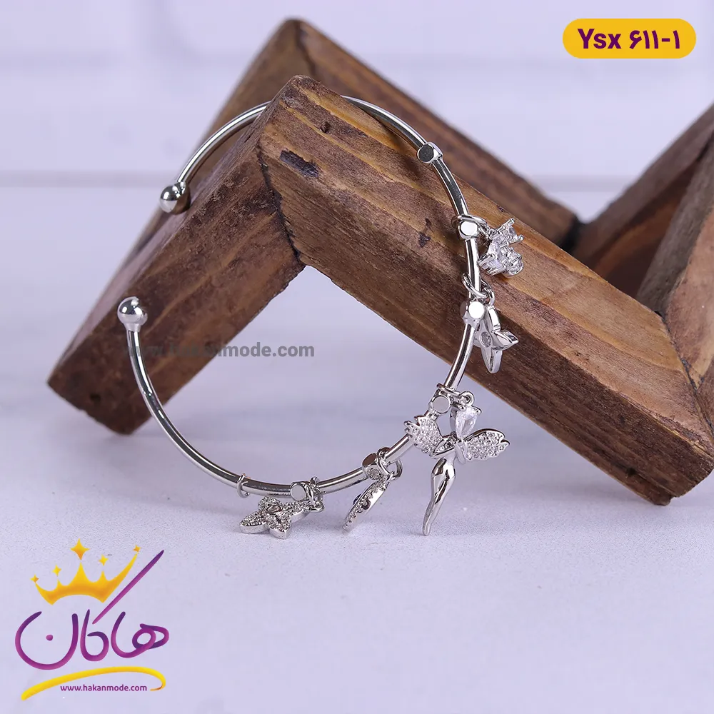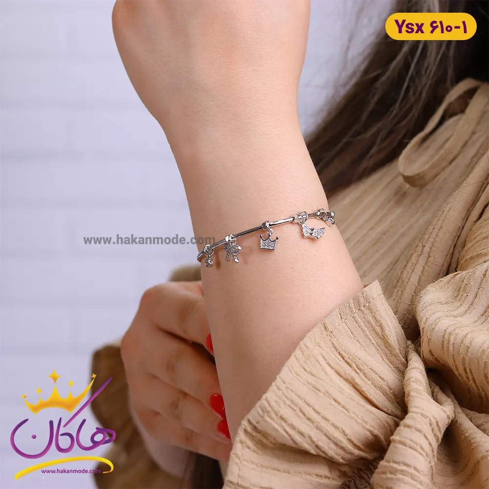 دستبند النگویی استیل زنانه آویز تاج و پاپیون | کد ysx610/1