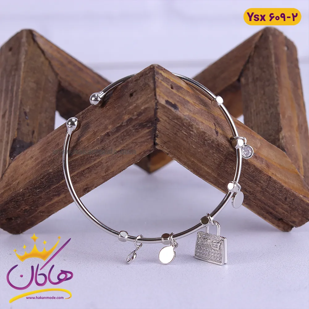 دستبند النگویی استیل زنانه آویز کیف نگین دار نقره ای | کد ysx609/2
