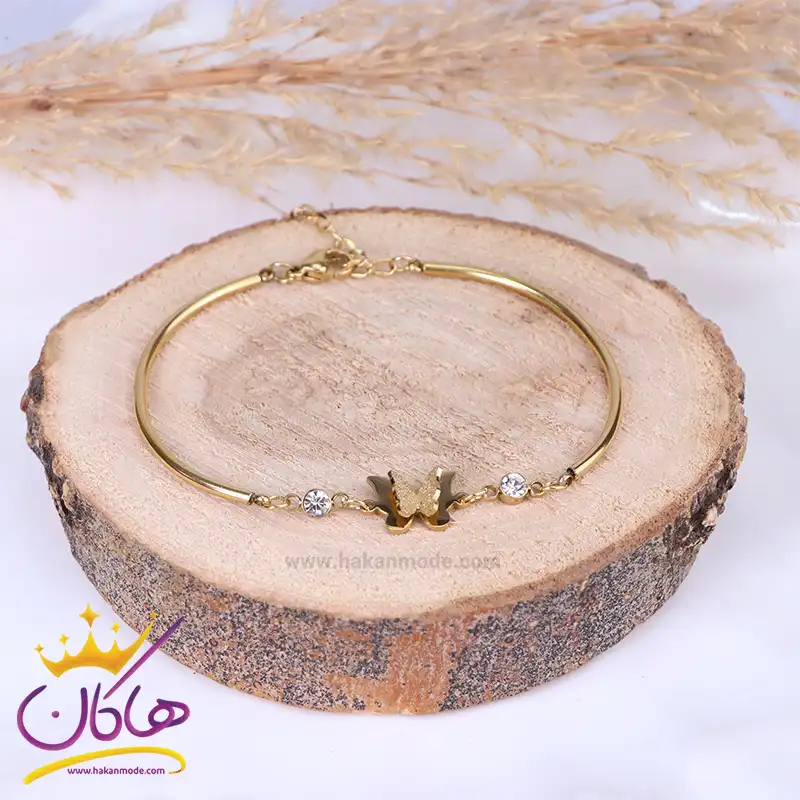 خرید دستبند استیل زنانه پروانه ای نگینی طلایی با بهترین قیمت دستبند استیل زنانه پروانه ای نگینی طلایی طرحی ساده