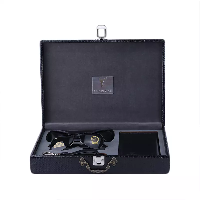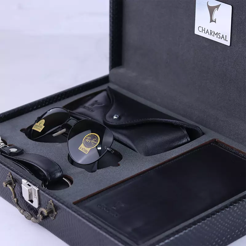 ست چرمی مردانه با کیف کتی و عینک و جاکلیدی چرمسال مشکی 180/1