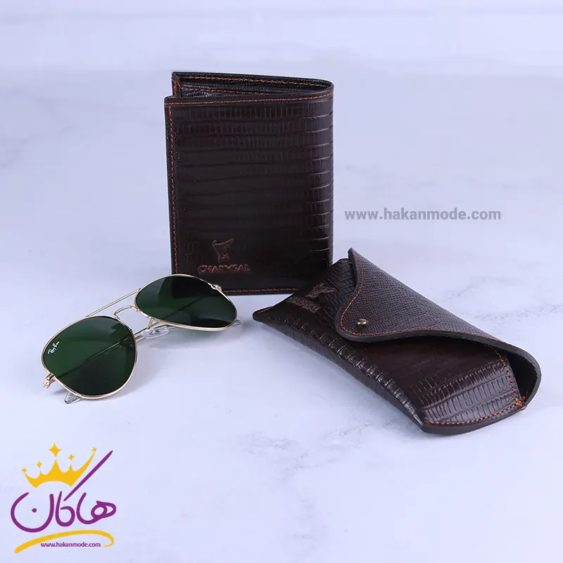 ست کیف چرم و عینک مردانه چرمسال قهوه ای 181/2