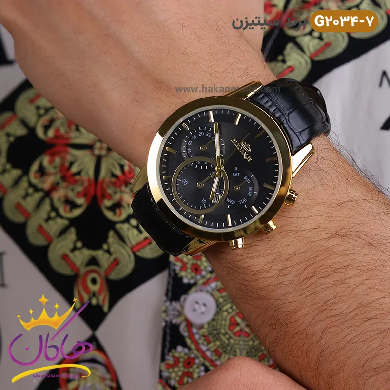 ساعت الگانس مردانه بند چرمی مشکی طلایی مدل G2034