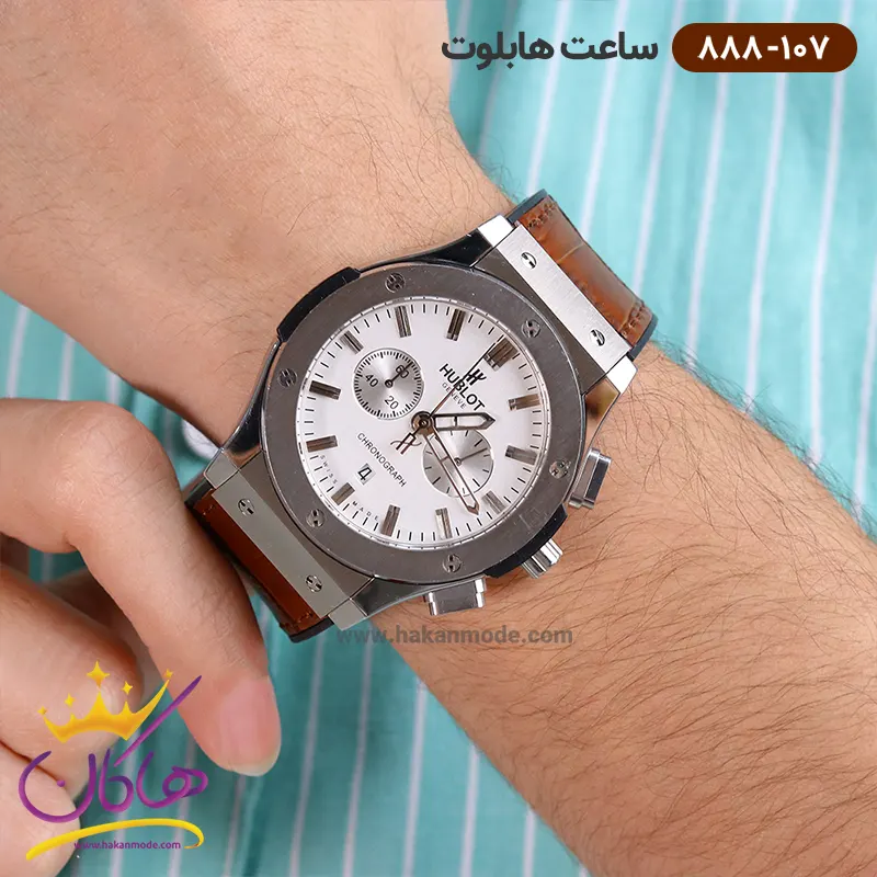 خرید ساعت هابلوت مردانه بند چرم قهوه ای صفحه سفید کرنوگراف 888/107 در خرید ساعت هابلوت مردانه بند چرمی، توجه