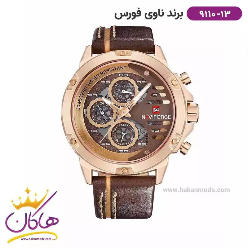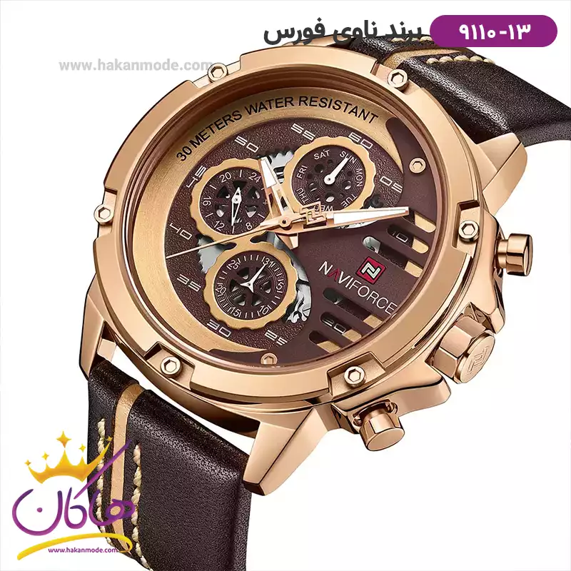 ساعت مردانه نیوی فورس بند چرم قهوه ای فول دیت 9110/13