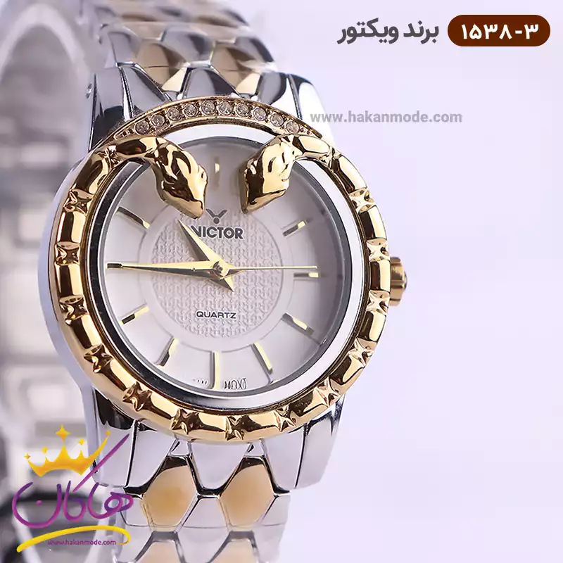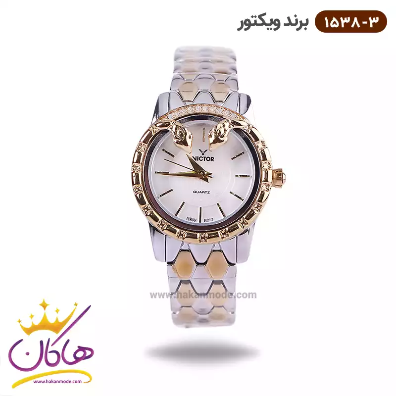 خرید ساعت ویکتور زنانه بند فلزی نقره ای طلایی طرح مار 1538/3 در خرید ساعت ویکتور زنانه فلزی، اورجینال بودن