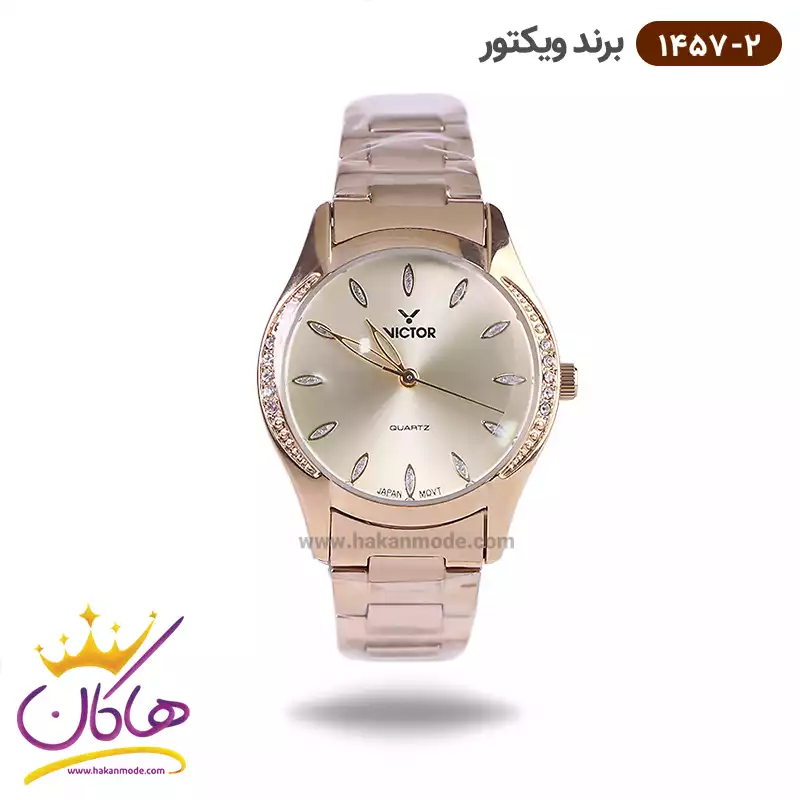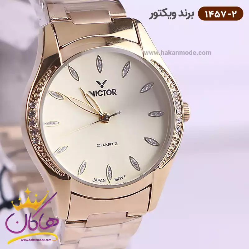 خرید ساعت ویکتور زنانه فلزی طلایی قاب نیم نگین 1457/2 در خرید ساعت ویکتور زنانه فلزی، اورجینال بودن از همه