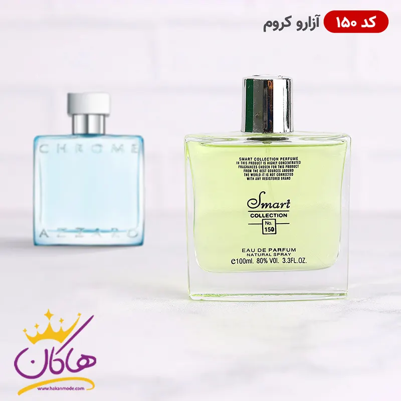 ادکلن اسمارت کالکشن کد ۱۵۰ مشابه با ادکلن کروم از برند آزارو می باشد. از نظر نزدیکی به رایحه تا حدود 70 الی 80 درصد به ادکلن اصلی نزدیک است و در مواردی حتی بیش از همتای اورجینال خود محبوبیت پیدا کرده است. اگر بخواهید قیمت هر دو ادکلن را مقایسه کنید، خواهید دید که ادکلن شرکتی به نسبت قیمت بسیار منصفانه، کیفیت مطلوبی دارد. ادکلن اصل دارای سه نت ابتدایی، میانی و پایه است که پیچیدگی خاصی ایجاد میکند، به طوری که وقتی عطر را استشمام میکنید بعد از کمی تمرکز گروههای بویایی آن را تشخیص میدهید اما در اسمارت کالکشن کد ۱۵۰ خط بو، روشن و سر راست و بیشتر شامل نت پایه میشود.