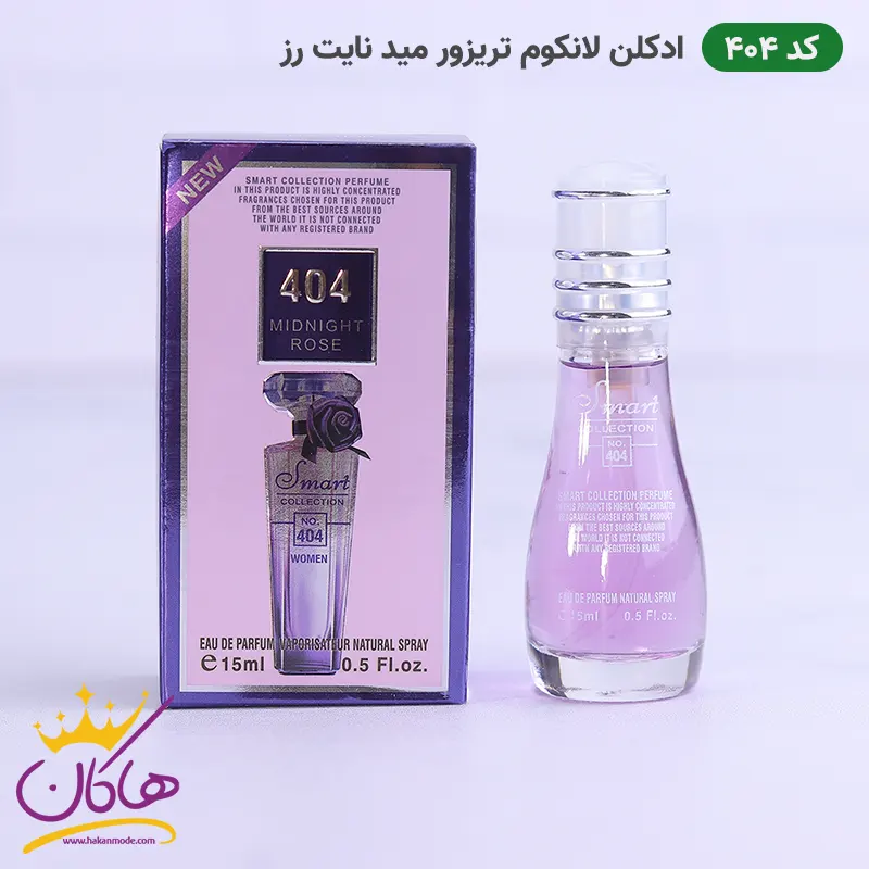 قیمت ادکلن اسمارت 404 لانکوم ترزور میدنایت رز 15 میل بسیار مناسب است. به‌صرفه بودن قیمت ادکلن اسمارت کالکشن به شما این امکان را می‌دهد که به جای یک ادکلن ثابت، چند ادکلن با روایح مختلف تهیه کنید و در هر فضایی ادکلن مناسب با آن را استفاده کنید.  در این کالکشن می‌توانید ادکلنهای مخصوص به فصول مختلف، همچنین جذابترین عطرهای زنانه و مردانه را پیدا کنید. برای دیدن سایر ادکلن های اسمارت کالکشن با ما همراه باشید و بهترین خرید عطر و ادکلن را در هاکان مد تجربه کنید. همچنین شما می‌توانید در سایت، انواع ادکلن اسمارت ۱۰۰ میل و ادکلن اسمارت ۲۵ میل را مشاهده کنید تا چندین نمونه از روایح مورد علاقه خود را انتخاب و امتحان کنید و هر کدام که بیشتر مورد پسندتان بود را خریداری کرده و به عطرامضای خود تبدیل کنید. اغلب افرادی که علاقه به داشتن یک عطر خاص به عنوان “عطرامضا” دارند، یک عطر جیبی از ادکلن خود را همیشه به همراه دارند تا در مواقع لزوم عطر خود را تمدید کنند آنها کمتر حاضر به استفاده از ادکلن دیگری می‌شوند. این عطرهای شرکتی پرفروش با غلظت eau de perfume (ادوپرفیوم) طراحی شده اند.