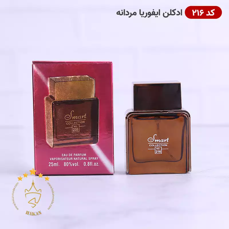 ادکلن جیبی 216 ایفوریا مردانه اسمارت کالکشن 25 میل مشابه با ادکلن سی کی ایفوریا مردانه -Ck Euphoria  از برند کالوین کلین است. از نظر نزدیکی به رایحه تا حدود 70 الی 80 درصد به ادکلن اصلی نزدیک است و در مواردی حتی بیش از همتای اورجینال خود محبوبیت پیدا کرده است. اگر بخواهید قیمت هر دو ادکلن را مقایسه کنید، خواهید دید که قیمت ادکلن شرکتی، به نسبت کیفیت آن بسیار مناسب است. ادکلن اصل دارای سه نت ابتدایی، میانی و پایه است که پیچیدگی خاصی ایجاد می‌کند، به طوری که وقتی عطر را استشمام می‌کنید بعد از کمی تمرکز گروههای بویایی آن را تشخیص می‌دهید اما در ادکلن جیبی 216 ایفوریا مردانه اسمارت کالکشن 25 میل  خط بو، روشن و سر راست و بیشتر شامل نت پایه می‌شود.