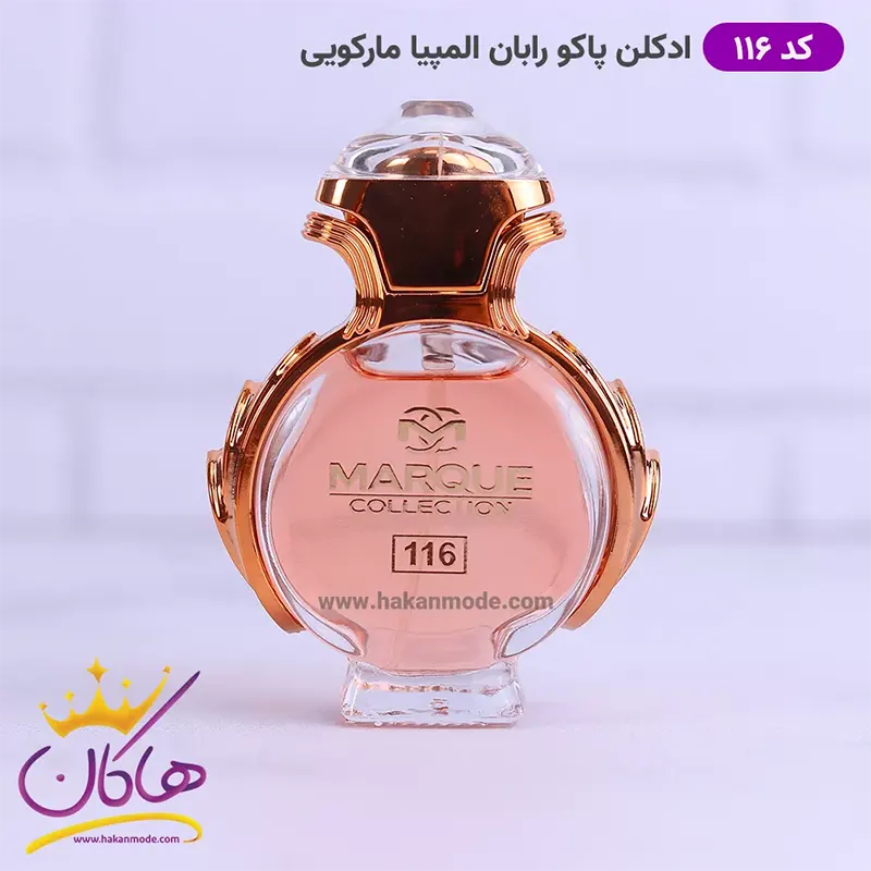ادکلن مارکویی 25 میل کد 116 مشابه با olympea از برند paco Rabanne است. از نظر نزدیکی به رایحه تا حدود 70 الی 80 درصد به ادکلن اصلی نزدیک است و در مواردی حتی بیش از همتای اورجینال خود محبوبیت پیدا کرده است. اگر بخواهید قیمت هر دو ادکلن را مقایسه کنید، خواهید دید که قیمت ادکلن شرکتی، به نسبت کیفیت آن بسیار مناسب است. ادکلن اصل دارای سه نت ابتدایی، میانی و پایه است که پیچیدگی خاصی ایجاد می‌کند، به طوری که وقتی عطر را استشمام می‌کنید بعد از کمی تمرکز گروههای بویایی آن را تشخیص می‌دهید اما در ادکلن مارکویی کالکشن زنانه المپیا 116 25 میل خط بو، روشن و سر راست و بیشتر شامل نت پایه می‌شود. ادکلن مارکویی 25 میل مینیاتوری یکی از باکیفیت ترین عطرهای مینی سایز می‌باشد که رایحه مشابه با اکثر برندهای مشهور جهان را با کیفیت بسیار بالا و با قیمت مناسب تولید کرده است. این عطرها با غلظت eau de perfume (ادوپرفیوم) طراحی شده اند. شباهت رایحه های تولید شده توسط این برند باورنکردنی بوده و از ماندگاری و پخش بوی بسیار عالی برخوردار هستند. رایحه ادکلن Marque Collection 116  مشابه عطر زنانه المپیا پاکو رابان است، پس همان حس طراوت را ایجاد می‌کند.