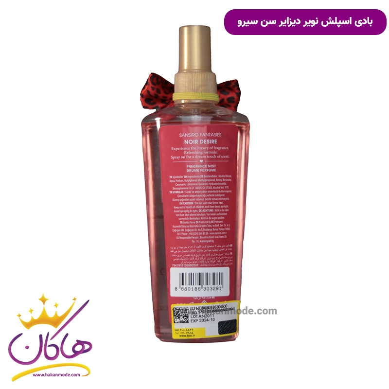 بادی اسپلش سن‌سیرو مدل NOIR DESIRE بادی اسپلش اورجینال سن‌سیرو با رایحۀ وانیلا بلومینگ گاردنیا ترکیبی از وانیل و شکوفه میوه است و بوی گرم و شیرینی دارد.  این محصول از شرکت سن‌سیرو ترکیه است هم خوشبو و هم با کلاس باشید. ادی اسپلش محصولی است که هم زنان و هم مردان می‌توانند از آن استفاده کنند.