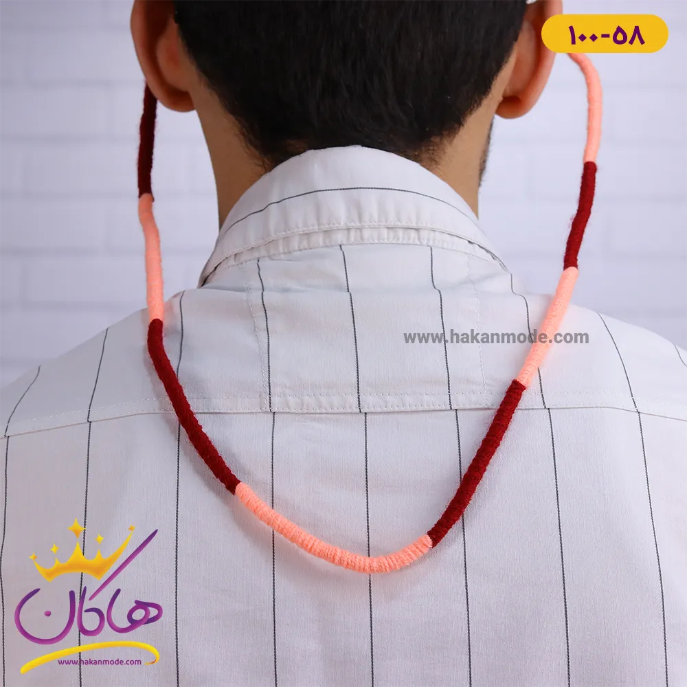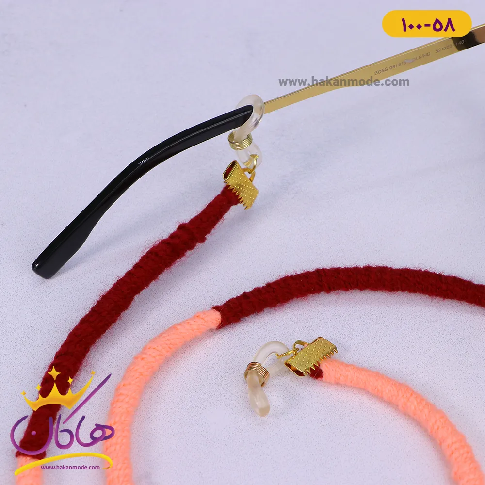 بند عینک کاموایی دو رنگ یکی از شیکترین و سبکترین مدلهای بند عینک است که به راحتی به دستهی عینک وصل شده و از عینک شما محافظت میکند. طول این بند 68 سانتیمتر و عرض آن 5 میلیمتر است. این بند شامل یک ریسمان بوده که دو رنگ کاموا زرشکی و گلبهی با فواصل حدود 10 سانتی متری، به دور آن پیچیده شده است. در قسمت اتصال بند به عینک یک گیره لاستیکی وجود دارد که به دسته عینک وصل میشود. این بند عینک قابل شستشو میباشد.