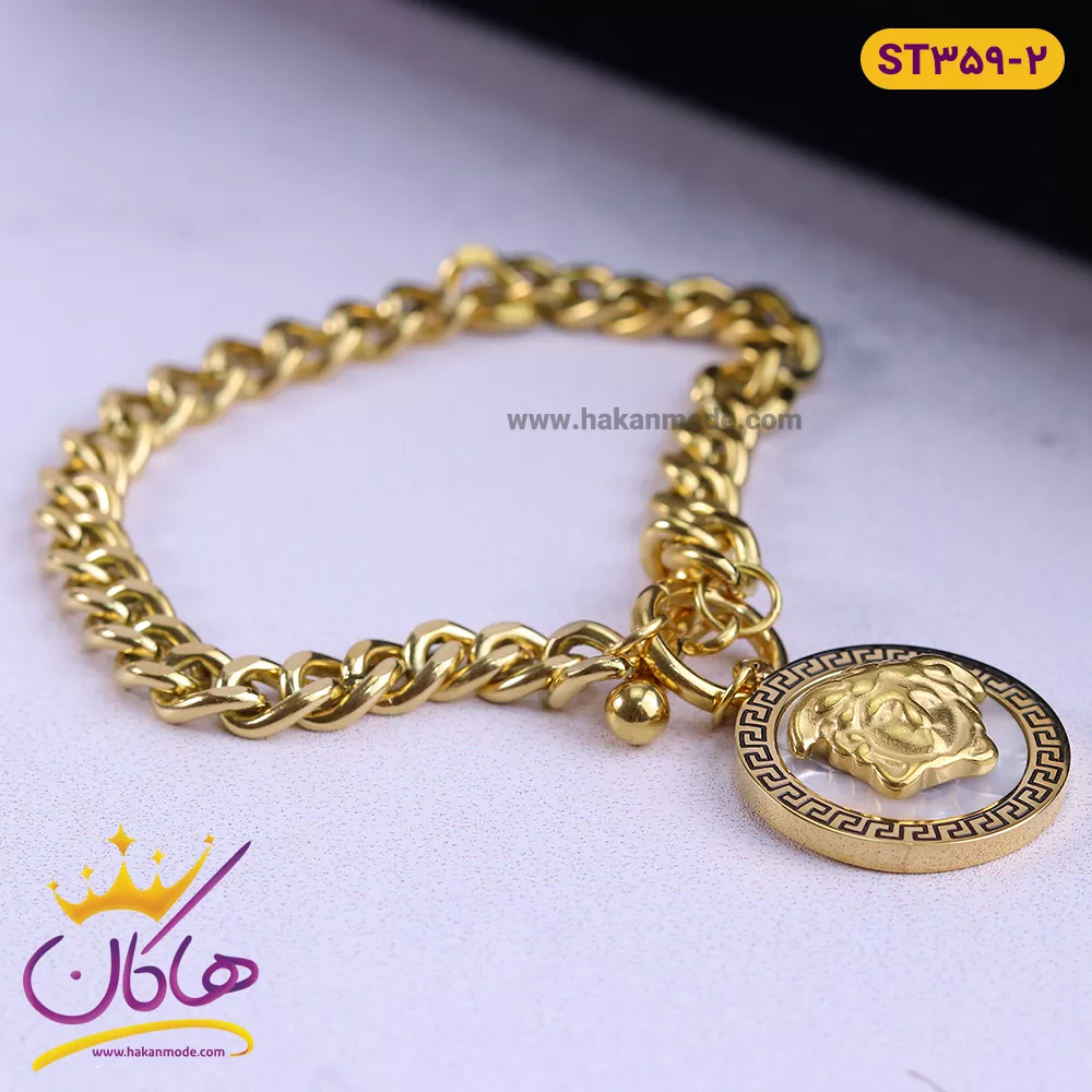 دستبند استیل زنانه ورساچه ST 359 با پهنای 6 میل و طول 22 سانتیمتر یکی از مدلهای دستبند لاکچری است که یک آویز بزرگ طرح ورساچه دارد به ارتفاع 21 میل، که باعث زیباتر شدن این دستبند می شود. این دستبند هم بر دستهای ظریف به خوبی می‌نشیند و هم روی دست تپل زیبایی خاص خود را دارد. نوع قفل این دستبند قفل حلقه و محور یا قفل T است که دو بخش کاملاً متفاوت دارد که در یک طرف آن حلقه ای توخالی و به شکل دایره و در طرف دیگر فلزی به شکل حرف انگلیسی T است. این نوع قفل معمولاً برای زیورآلات سنگین تر و زنانه مناسب است. این قفل در اندازه های مختلف ساخته می شود و به دلیل زیبایی منحصر به فرد آن میتوان آن را هم به تنهایی و هم با آویز به کار برد. بافت زنجیر این دستبند پیوسته و یکدست است و به علت داشتن پهنای مناسب بهتر است به تنهای مورد استفاده قرار بگیرد. رنگ دستبند استیل زنانه ورساچه ST 359 طلایی است.