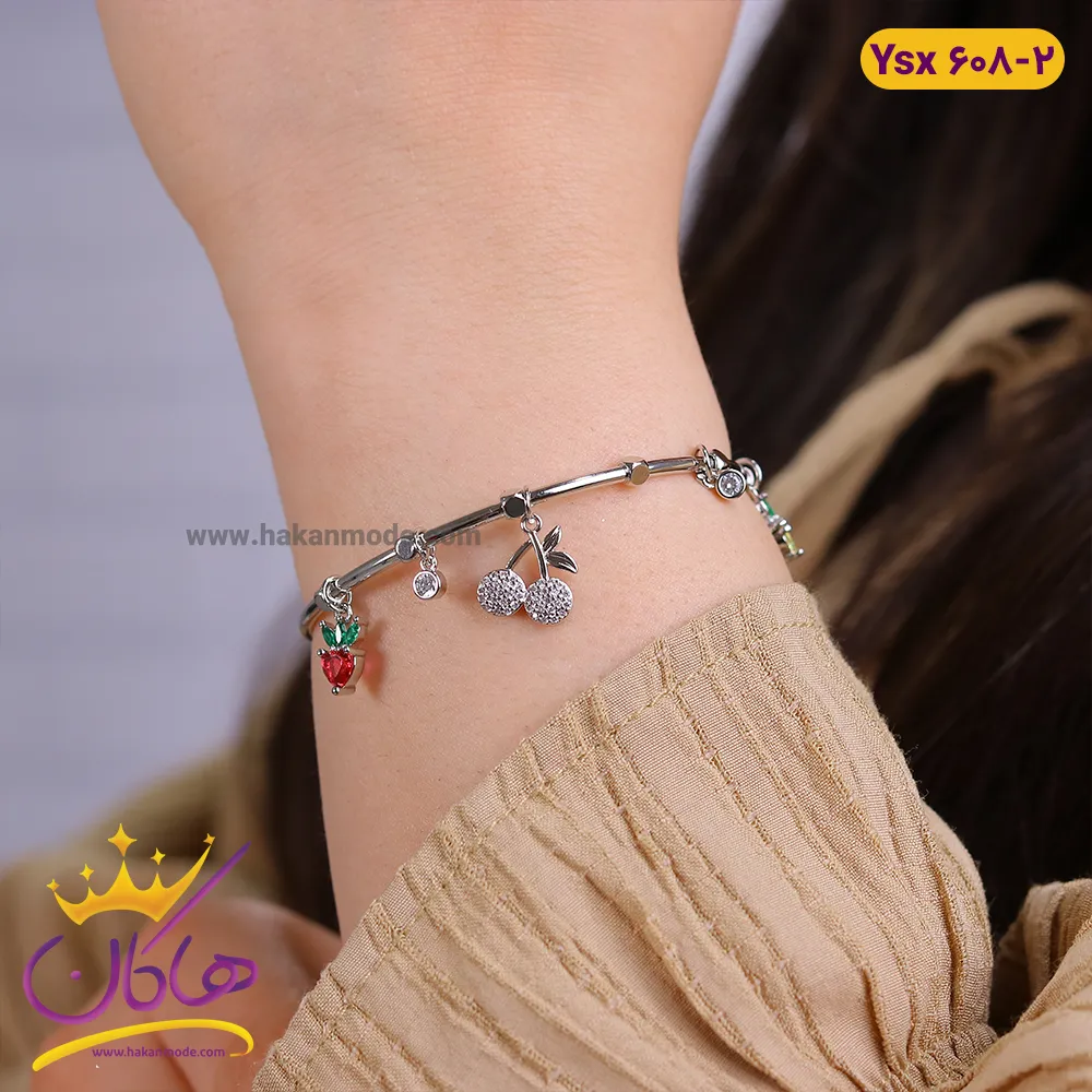 دستبند النگویی استیل زنانه آویز میوه ای نقره ای روی دست