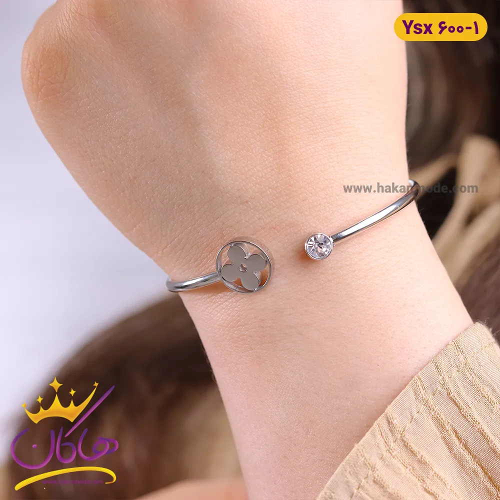 دستبند النگویی نقرهای نگیندار زنانه در واقع یک النگو ظریف و باریک به رنگ نقرهای است که دو طرف آن به هم متصل نبوده و قسمت باز آن روی دست قرار میگیرد. روی یکی از قسمتهای باز انتهای دستبند یک گل چهار پر نقرهای براق که در یک قاب گرد قرار گرفته و الهام گرفته از برند لویی ویتون است و روی سر دیگر، یک نگین گرد به چشم میخورد. قطر این دستبند نیز 6 سانتیمتر میباشد.
