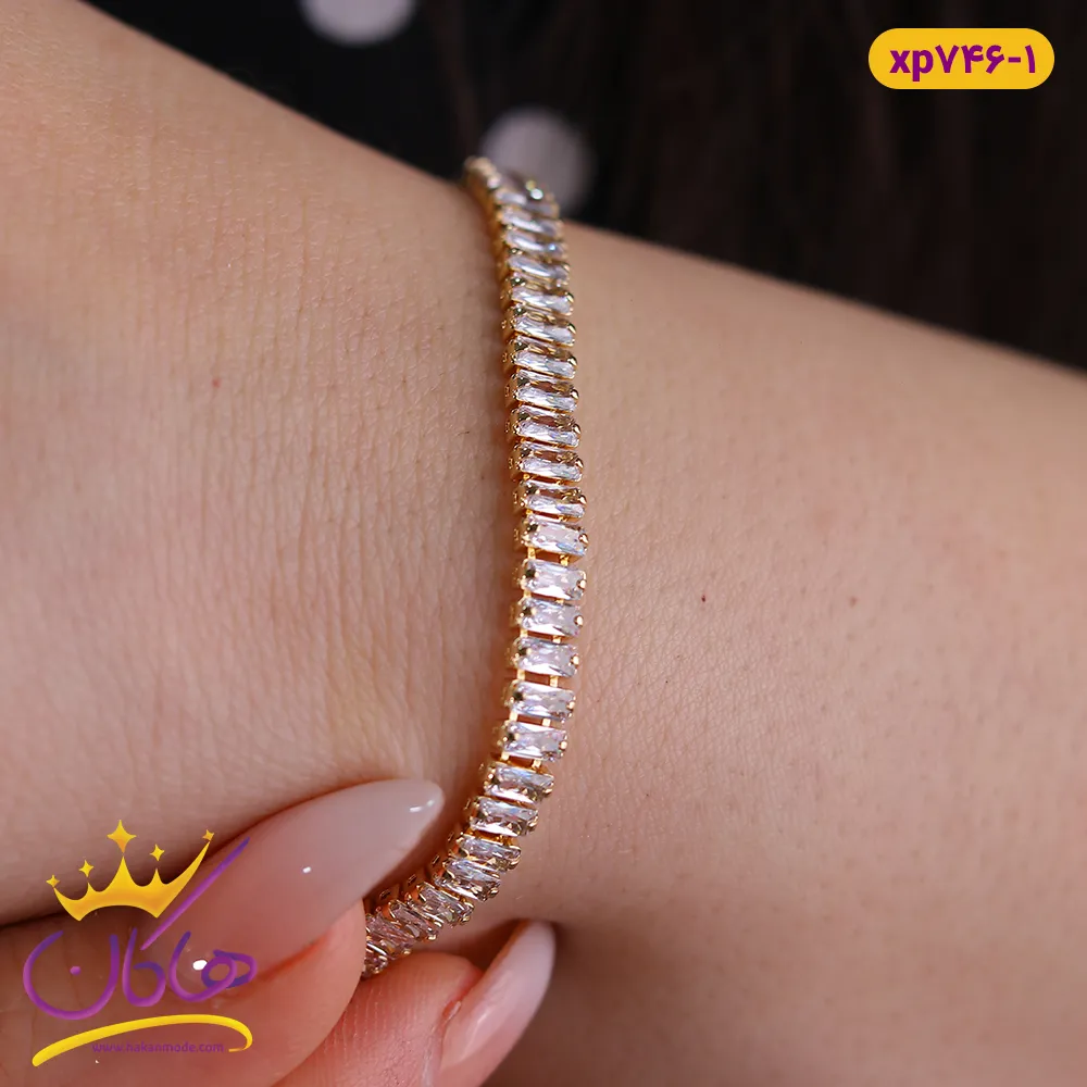 دستبند تمام نگین باگتی با پهنای 5 میل و طول 19 سانتیمتر ، یکی از مدلهای دستبند نازک است که هم بر دستهای ظریف خوبی مینشیند و هم روی دست تپل زیبایی خاص خود را دارد.نحوه بسته شدن این دستبند به صورت قفل تاشو است که هم از لحاظ زیبایی و هم از لحاظ بسته شدن محکم چفت میشود و قفلی با قابلیت اعتماد بالا و در رده ی قفل های شیک می باشد در دو سایز مختلف است. بافت زنجیری این دستبند فقط با نگین های باگتی است و میتوان آن را با همه ی استایل های خود ست کرد. دستبند تمام نگین باگتی به رنگ طلایی است.