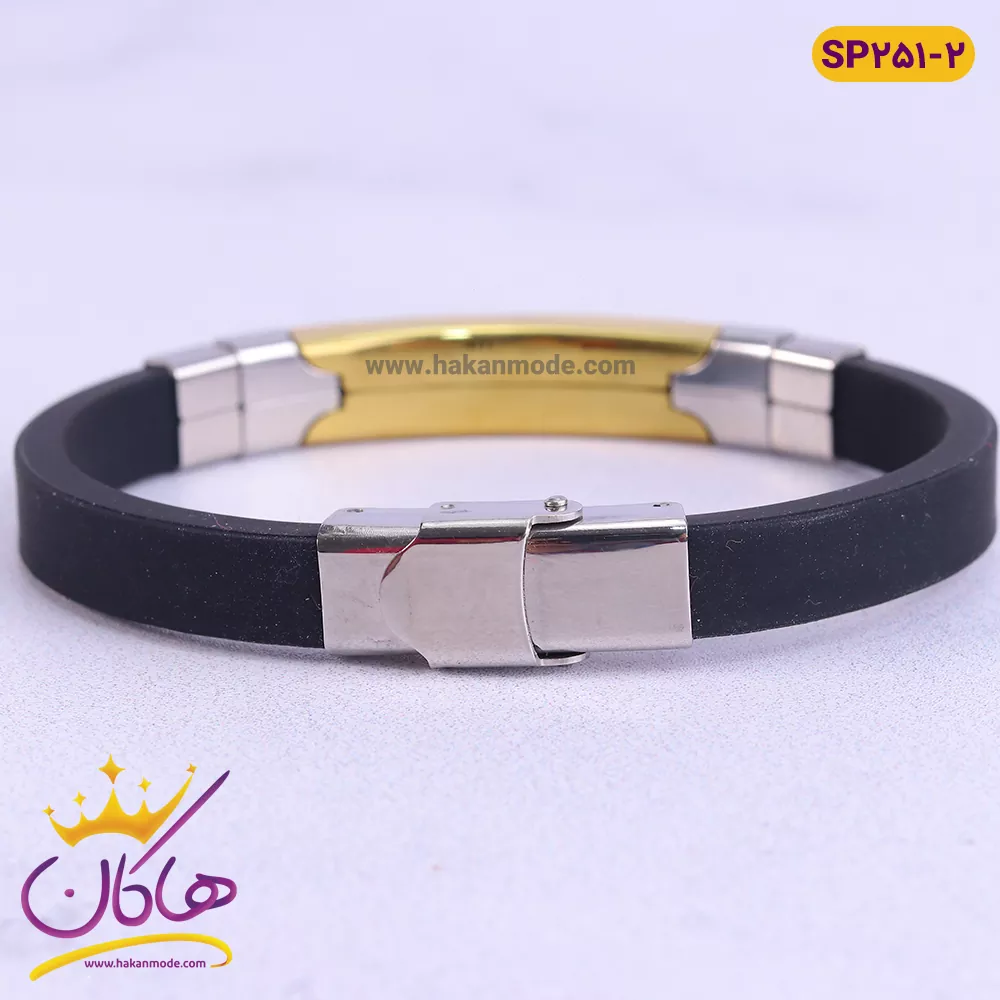 دستبند رابر مردانه رولکس sp251/2  از یک بند 1cm از جنس رابر که نوعی پلاستیک مقاوم و با کیفیت است تشکیل شده. طول این دستبند 21cm میباشد و یک پلاک مستطیل شکل در وسط آن قرار گرفته، که طرح تاج و نام ROLEX با رنگ نقره ای روی آن نوشته شده است. پلاک این دستبند از دو قسمت تشکیل شده، که قسمت میانی آن طلایی، و دو قسمت انتهایی آن به رنگ نقره ای است. همچنین دو گیره فلزی نقره ای رنگ در سمت راست و چپ پلاک، زیبایی خاصی به این دستبند بخشیده است. پلاک دستبند رابر مردانه رولکس sp251/2 از جنس استیل است. قفل این کار به صورت چفتی بسته میشود و به رنگ نقره ای است.