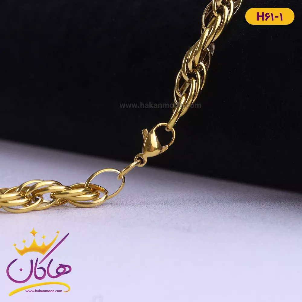 زنجیر استیل مردانه طلایی H61/1 با عرض 6 میلی متر و طول حدود 60 سانتیمتر از مدلهای ظریف و جذاب زنجیر استنلس استیل است که هم مورد علاقه آقایان است و هم گاهی توسط خانمهای خاص پسند مورد استفاده قرار می‌گیرد. استیل این زنجیر از بهترین و باکیفیت ترین نوع استیل است و ایجاد حساسیت نمی‌کند. در اصل این زنجیر از حلقه های به هم پیوسته و مارپیچ است و بهم تافته شده اند. این زنجیر به طرح طنابی است. رنگ طلایی این زنجیر، ثابت است و در اثر استفاده روزانه زیبایی خود را از دست نمی‌دهد. قفل زنجیر استیل مردانه طلایی H61/1 از مدل خرچنگی است و هم محکم و مطمئن است و هم به راحتی بسته می‌شود.