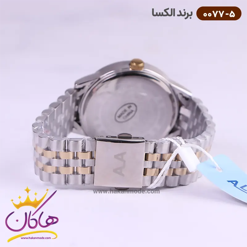 ساعت الکسا مردانه فلزی کد 0077/5 ظاهری کلاسیک و جذاب دارد. این ساعت استیل طلایی/نقره‌ای، رنگ ثابت و ضدحساسیت است. اصلی‌ترین چیزی که در ساعت مردانه الکسا توجه ما را به خود جلب می‌کند، همخوانی رنگ بند با قاب طلایی آن است. صفحه‌ی این ساعت سفید و عقربه‌ها، شبنما و اندکس‌های ساعت خطی و طلایی هستند. تقویم کنار عدد 3 قرار گرفته است و کاملا خوانا و واضح است. اگر به درون صفحه نگاه کنید، نام برند الکسا زیر ساعت 12 دیده می‌شود. در کنار صفحه یک پیچ کوک برای تنظیم زمان وجود دارد. بند ساعت، فلزی و از نوع استیل مرغوب است که باعث تعرق و خارش نمی‌شود. طرح این بند از یک بافت ریز و درشت تشکیل شده است.