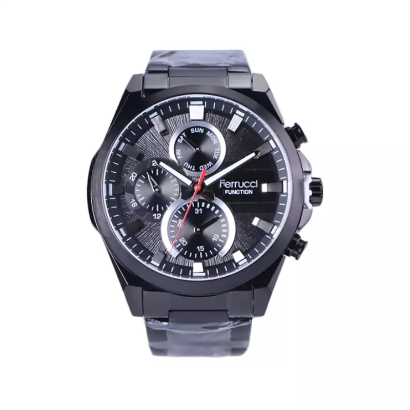 ساعت الگانس رویال مردانه بند چرم مشکی ظاهری مدرن و جذاب دارد. قاب این ساعت چند ضلعی و به رنگ استیل نقره ای، رنگ ثابت و ضدحساسیت است. اصلی‌ترین چیزی که در ساعت مردانه الگانس توجه ما را به خود جلب می‌کند، صفحه‌ی طرحدار و قهوه ای رنگ ساعت است. اگر به داخل ساعت نگاه کنید، سه صفحه‌ی دایره‌ای می‌بینید که هر کدام از آنها نشان دهنده‌ی پارامتری خاص هستند. یک صفحه روز‌های هفته را نشان می‌دهد. صفحه‌ی سمت چپی ساعت را به صورت 24 ساعته نشان می‌دهد. اگر از افرادی هستید که امور خود را بر اساس تایم 24 ساعته تنظیم می‌کنید این صفحه کوچک به کار شما می‌آید. یک صفحه که پایین قرار دارد همان تقویم ساعت است. عقربه‌های این ساعت رزگلد رنگ و شبنما هستند و همچنین اندکس‌های این ساعت خطی و رزگلد براق هستند. نام برند ELEGANCE کنار ساعت 3 دیده می‌شود. بند ساعت از نوع چرم مرغوب است که پوسته پوسته و بریده نمی‌شود، همچنین باعث تعرق و خارش نمی‌شود. قفل این ساعت از مدل پروانه‌ای دکمه‌دار است و ساعت به راحتی از دست نمی‌افتد. این مدل قفل، مثل قفل کمربندی روی بند ترک یا بریدگی ایجاد نمی‌کند و از محبوبترین قفل‌ها است.