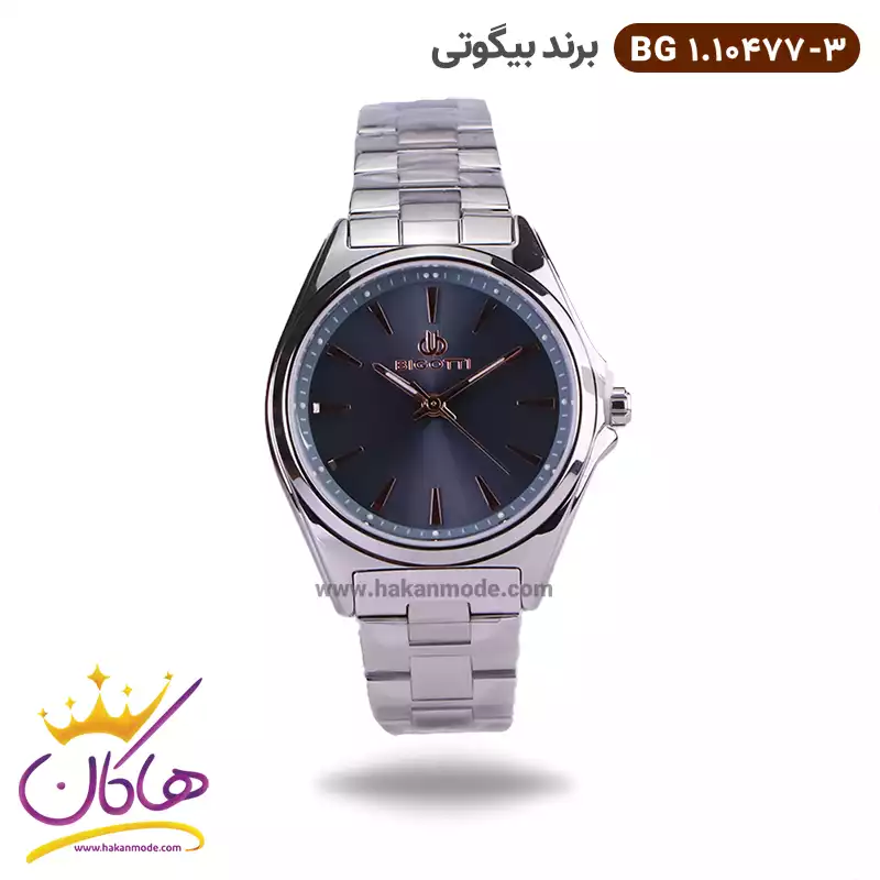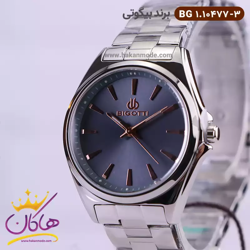 ساعت بیگوتی زنانه فلزی کد 10477/3 ظاهری کلاسیک و جذاب دارد. این ساعت استیل نقره‌ای، رنگ ثابت و ضدحساسیت است. اصلی‌ترین چیزی که در ساعت بیگوتی زنانه توجه ما را به خود جلب می‌کند همخوانی رنگ بند با قاب نقره‌ای ساعت است. صفحه‌ی این ساعت طوسی بوده و اندکس‌‌های آن خطی و رزگلد طراحی شده‌اند. نام برند bigotti زیر ساعت 12 دیده می‌شود. در کنار صفحه یک پیچ کوک برای تنظیم زمان وجود دارد. بند ساعت، از یک بافت ریز و درشت تشکیل شده و نقره‌ای است. همچنین جنس بند فلزی و از نوع استیل مرغوب است که باعث تعرق و خارش نمی‌شود. قفل آن از مدل سه‌تکه دکمه‌دار است که از دسته قفل‌های محکم و مطمئن است.