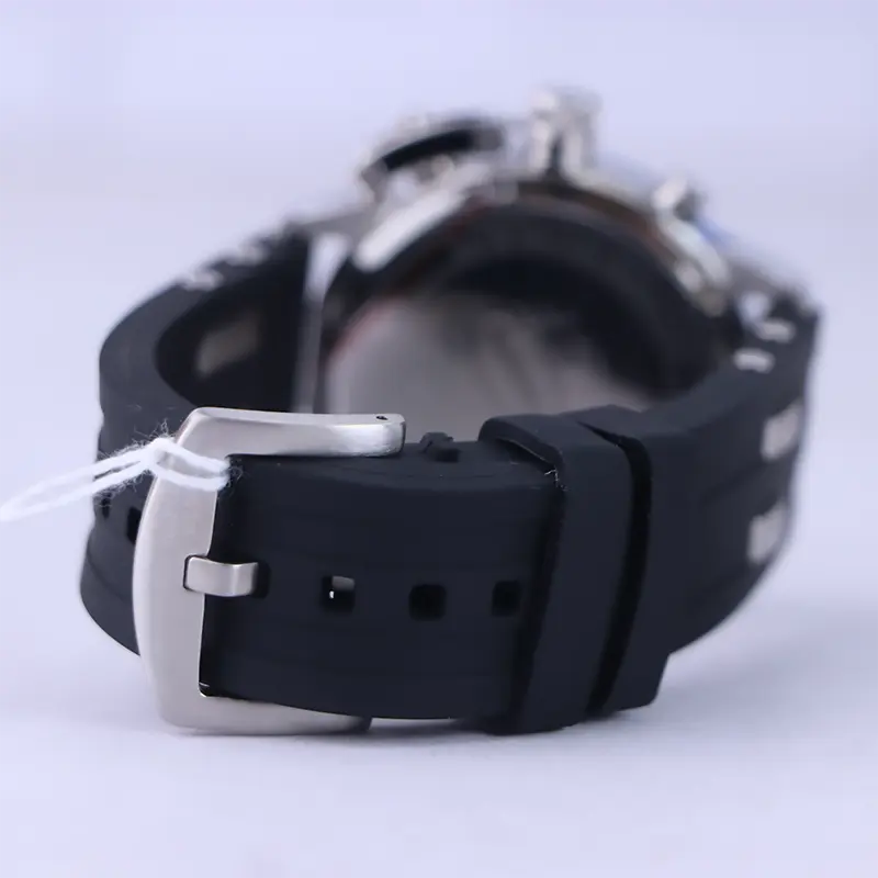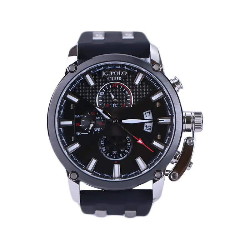ساعت مچی جی جی پولو مردانه بند رابر مشکی ظاهری مدرن و جذاب دارد. قاب این ساعت استیل مشکی، رنگ ثابت و ضدحساسیت است. اگر به داخل ساعت نگاه کنید، صفحهی این ساعت به رنگ مشکی و طرحدار است و سه صفحه دایرهای کوچک میبینید که هر کدام از آنها نشان دهندهی پارامتری خاص هستند. یک صفحه که سمت چپ قرار دارد روزهای هفته را نشان میدهد. صفحهی بالایی، ساعت را به صورت 24 ساعته نشان میدهد. اگر از افرادی هستید که امور خود را بر اساس تایم 24 ساعته تنظیم میکنید این صفحه کوچک به کار شما میآید. صفحهی پایینی، dual time یا دو زمانه است. ساعت دو زمانه ساعتی است که به طور هم زمان میتواند دو زمان مختلف مربوط به دو منطقه متفاوت را نمایش دهد. به صورتی که میتوانید با داشتن این ساعت زمان دو کشور متفاوت را در یک صفحه داشته باشید. یک اسکرول کوچک در بین اعداد 2 و 4 وجود دارد که همان تقویم ساعت است. بند ساعت از نوع رابر مرغوب و ضد حساسیت است. این بند مشکی رنگ بوده و باعث تعرق و خارش نمیشود. اندکسهای این ساعت به صورت خطی شبنما و عقربههای آن شبنما طراحی شدهاند. لوگوی برند جی جی پولو کلاب را روی عدد ۱۲ میبینید. در کنار صفحه یک پیچ کوک و دو دکمه برای تنظیم زمان وجود دارد.