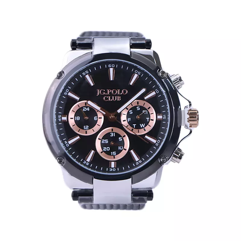 ساعت جی جی پولو مردانه فلزی بند حصیری ظاهری مدرن و جذاب دارد. این ساعت استیل مشکی، رنگ ثابت و ضدحساسیت است. اگر به داخل ساعت نگاه کنید، صفحه‌ی این ساعت به رنگ مشکی راه راه است و سه صفحه دایره‌ای کوچک و قاب رزگلد می‌بینید که هر کدام از آنها نشان دهنده‌ی پارامتری خاص هستند. یک صفحه که سمت راست قرار دارد روز‌های هفته را نشان می‌دهد. صفحه‌ی سمت چپ ساعت را به صورت 24 ساعته نشان می‌دهد. اگر از افرادی هستید که امور خود را بر اساس تایم 24 ساعته تنظیم می‌کنید این صفحه کوچک به کار شما می‌آید. یک صفحه که پایین قرار دارد روز‌های ماه را نشان می‌دهد. بند ساعت، حصیری و از نوع فلز مرغوب است که باعث تعرق و خارش نمی‌شود. اندکس‌های این ساعت به صورت خطی رزگلد و عقربه‌های آن شبنما طراحی شده‌اند. لوگوی برند جی جی پولو کلاب را زیر عدد ۱۲ می‌بینید. قفل این ساعت از نوع کلیپسی است به صورت ریلی می‌توانید آن را تنظیم کنید. در کنار صفحه یک پیچ کوک و دو دکمه برای تنظیم زمان وجود دارد.