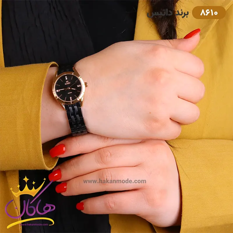 ساعت داتیس زنانه بند استیل مشکی قاب رزگلد 8610/1 نمای روی دست از نزدیک