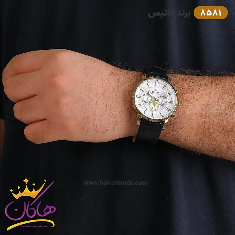ساعت داتیس مردانه بند چرم مشکی قاب طلایی 8581/3 نمای روی دست