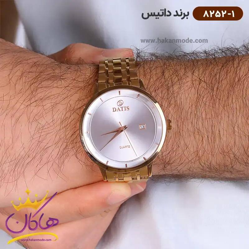 ساعت داتیس مردانه فلزی کد G8252/1 ظاهری کلاسیک و جذاب دارد. این ساعت استیل رزگلد، رنگ ثابت و ضدحساسیت است. اصلی‌ترین چیزی که در ساعت داتیس مردانه توجه ما را به خود جلب می‌کند همخوانی رنگ بند با قاب رزگلد ساعت است. صفحه‌ی این ساعت نقره‌ای بوده و اندکس‌‌های آن خطی و رزگلد طراحی شده‌اند. یک مربع کوچک در کنار ساعت 3 وجود دارد که همان تقویم ساعت است. نام برند DATIS زیر ساعت 12 دیده می‌شود. در کنار صفحه یک پیچ کوک برای تنظیم زمان وجود دارد. بند ساعت، از یک بافت ریز و درشت تشکیل شده و رزگلد است. همچنین جنس بند فلزی و از نوع استیل مرغوب است که باعث تعرق و خارش نمی‌شود. قفل آن از مدل سه‌تکه دکمه‌دار است که از دسته قفل‌های محکم و مطمئن است.