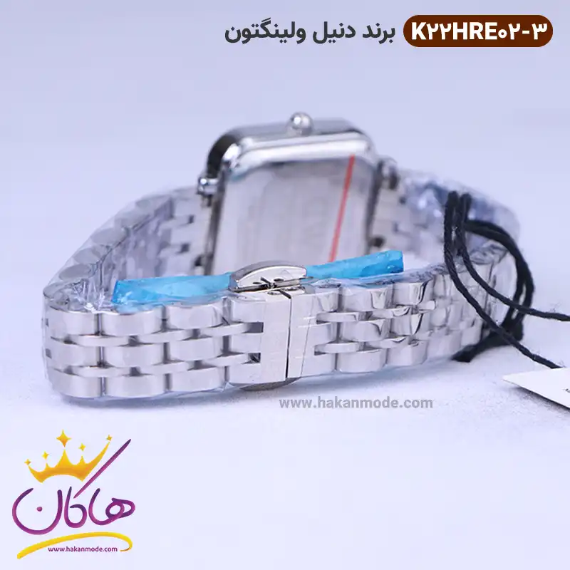 ساعت دنیل ولینگتون زنانه فلزی نقره ای ظاهری کلاسیک و جذاب دارد. این ساعت استیل نقره ای، رنگ ثابت و ضدحساسیت است. اصلیترین چیزی که در ساعت زنانه دنیل ولینگتون توجه ما را به خود جلب میکند، قاب مربع شکل و نقره ای رنگ ساعت است که بر شیکی آن افزوده است. اگر به درون ساعت دقت کنید، صفحهی ساعت سبز رنگ است که عقربهها نیز، نقره ای و اندکسها خطی و نقره ای طراحی شدهاند. نام برند دنیل ولینگتون زیر ساعت 12 دیده میشود. در کنار صفحه یک پیچ کوک برای تنظیم زمان وجود دارد. بند ساعت، فلزی و از نوع استیل مرغوب است که باعث تعرق و خارش نمیشود. طرح این بند از یک بافت ریز و درشت تشکیل شده است و قفل این ساعت عقربهای زنانه از مدل پروانه ای دکمهدار است که از دسته قفلهای محکم و مطمئن است.