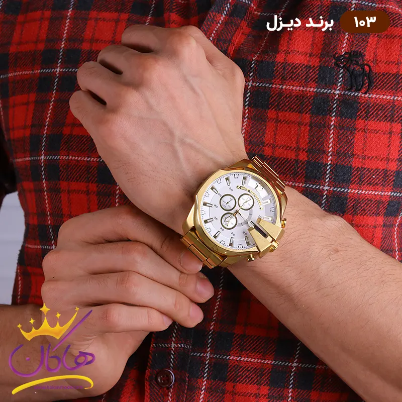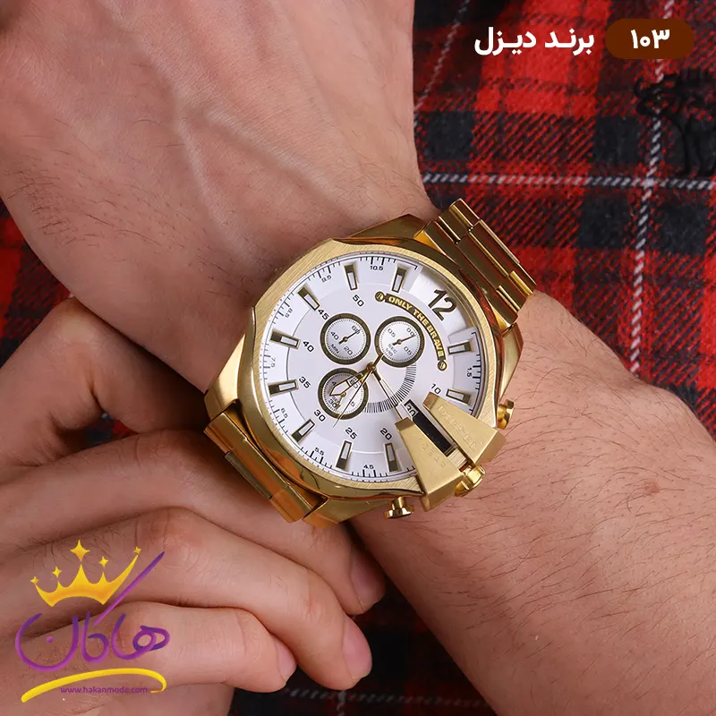 ساعت دیزل شاخدار طلایی صفحه سفید مردانه روی دست