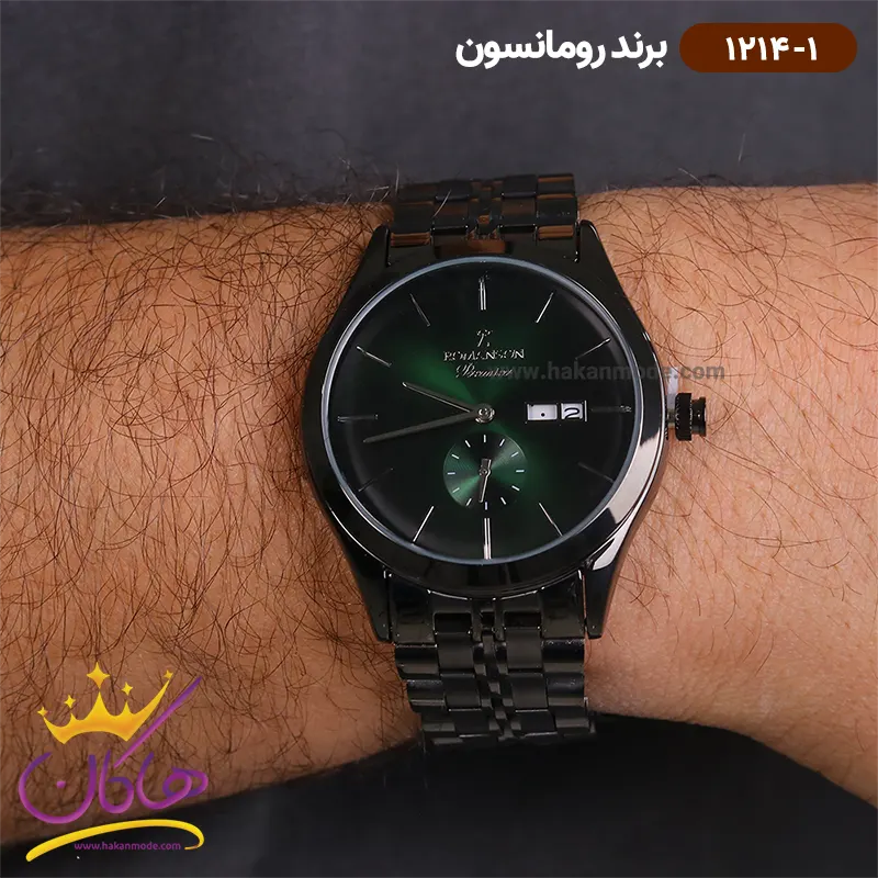 ساعت رومانسون مردانه فلزی 1214/1 ظاهری کلاسیک و جذاب دارد. قاب این ساعت به رنگ مشکی، رنگ ثابت و ضدحساسیت است. اگر به داخل ساعت نگاه کنید، صفحهی این ساعت به رنگ سبز است و درون آن یک عدد دایره میبینید که همان ثانیه شمار ساعت است. به این نوع ساعتها اصطلاحا زیر ثانیه میگویند. در کنار موقعیت ساعت ۳، یک مربع کوچک وجود دارد که نشان دهندهی تقویم ساعت است. عقربههای این ساعت نقرهای و همچنین اندکسهای این ساعت خطی و نقرهای هستند. نام برند ROMANSON زیر ساعت 12 دیده میشود. بند ساعت، از یک بافت ریز و درشت تشکیل شده و مشکی رنگ است. همچنین جنس بند فلزی و از نوع استیل مرغوب است که باعث تعرق و خارش نمیشود قفل این ساعت از مدل پروانهای دکمهدار است و ساعت به راحتی از دست نمیافتد.