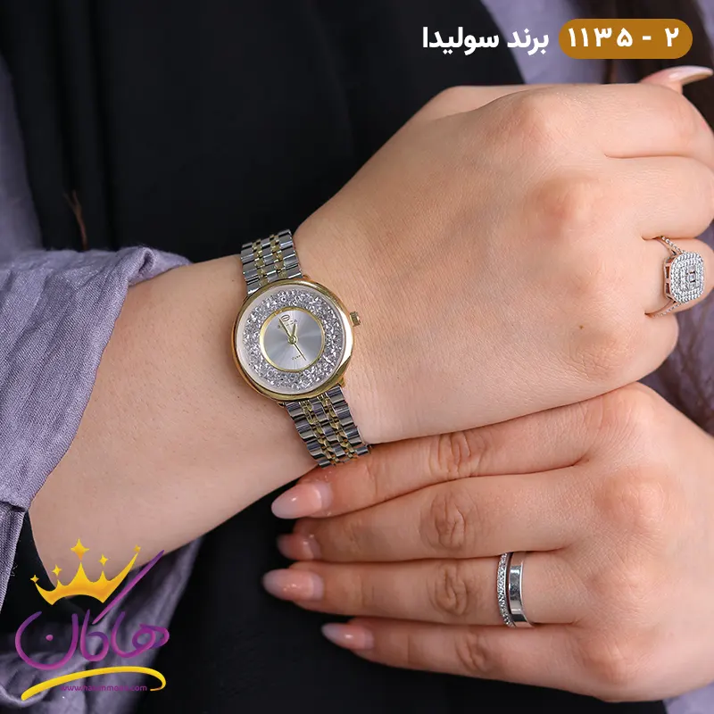 ساعت زنانه سولیدا نگین دار نقره ای طلایی روی دست