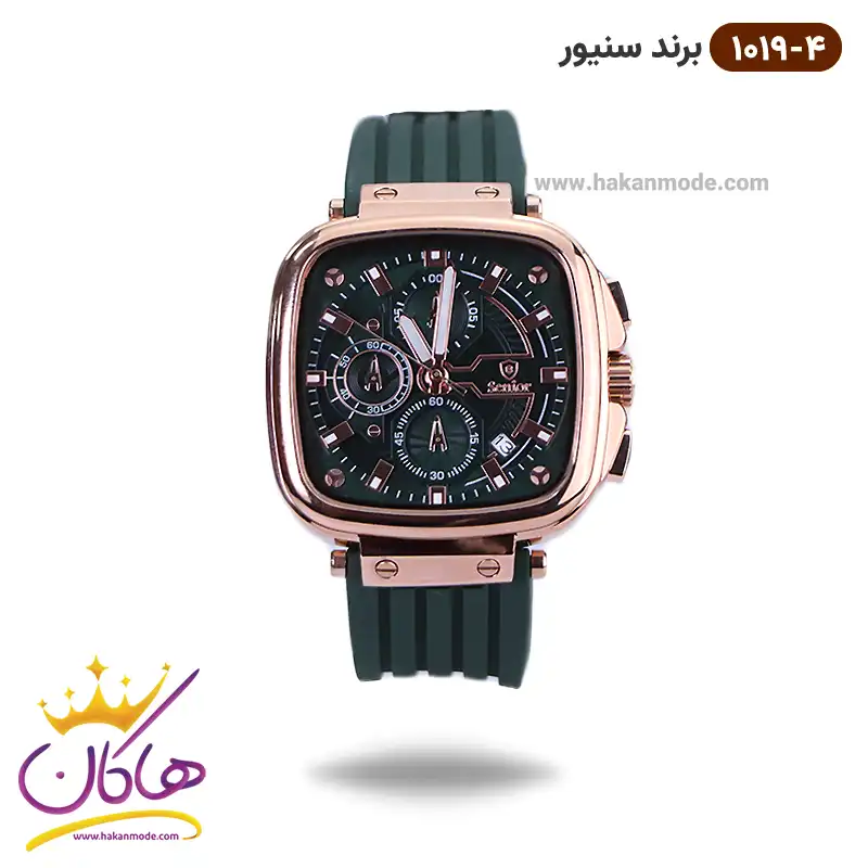 ویژگی ساعت سنیور مردانه بند رابر سبز قاب مربع رزگلد کرنوگراف 1019