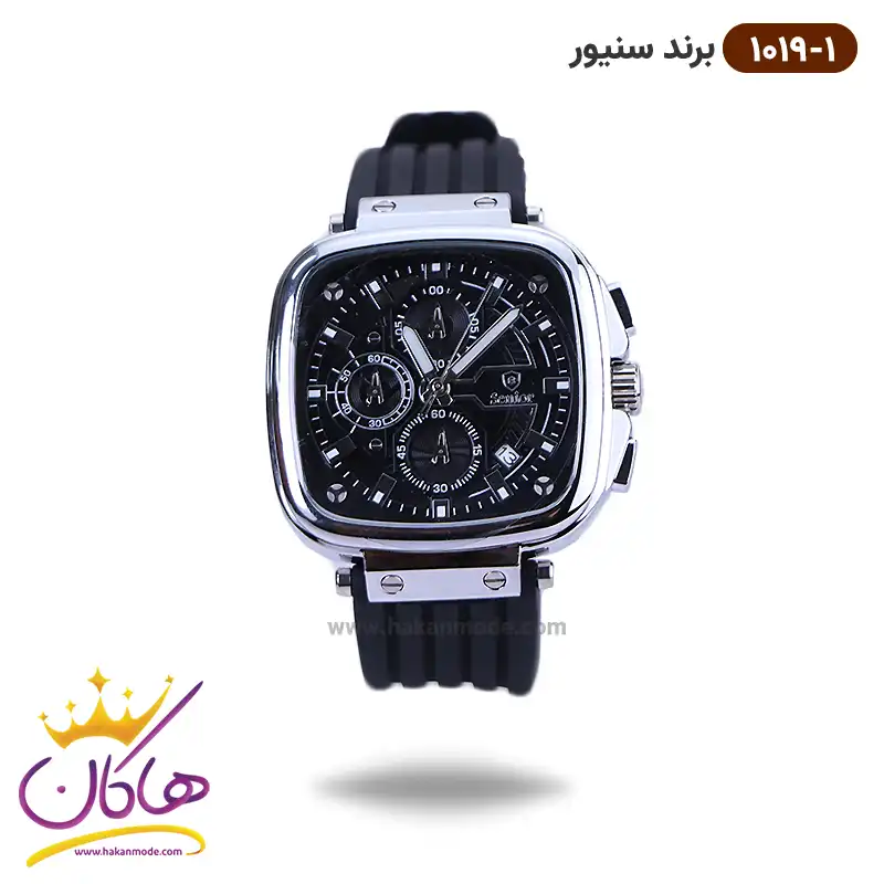 خرید ساعت سنیور مردانه بند رابر مشکی قاب مربع نقره ای کرنوگراف 1019