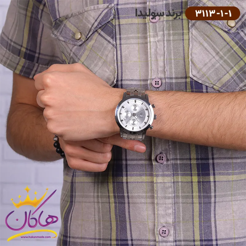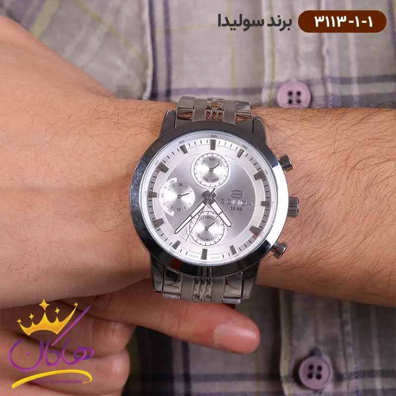 ساعت سولیدا بند استیل ست 3113/1 ظاهری مدرن و جذاب دارد. این ساعت استیل نقرهای، رنگ ثابت و ضدحساسیت است. علاوه بر ویژگیهای ظاهری اگر به داخل ساعت نگاه کنید، سه صفحه دایرهای کوچک میبینید. دایرههای موجود در صفحهی ساعت شما هر کدام نشان دهندهی پارامتری خاص هستند. یک صفحه روزهای هفته را نشان میدهد. دایرهی دیگر زمان را به صورت 24 ساعت نشان میدهد. دایرهی بعدی نشان دهندهی روزهای ماه است. داشتن اندکسهای خطی براق و عقربههای شبنما به شما این امکان را میدهد که در شب و محیطهای کم نور هم گذر زمان را ببینید. در کنار این ساعت یک پین (دسته کوک) و دو دکمه قرار دارد که برای تنظیم تقویم و ساعت است. قفل این ساعت از نوع پروانهای دکمهدار است و ساعت به راحتی از دست نمیافتد. نام برند SOLIDA کنار ساعت 3 نمایان است. بند ساعت، از یک بافت ریز و درشت تشکیل شده و فلز آن از نوع استیل مرغوب است که باعث تعرق و خارش نمیشود.