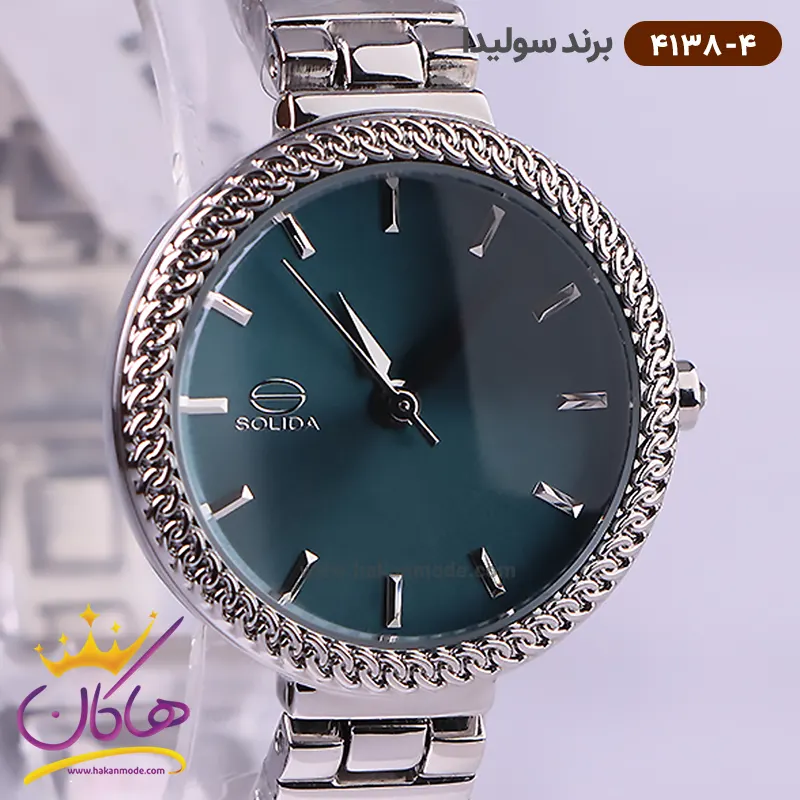 ساعت سولیدا زنانه بند استیل 4138/4 ظاهری کلاسیک و جذاب دارد. این ساعت استیل نقره‌ای، رنگ ثابت و ضدحساسیت است. اصلی‌ترین چیزی که در ساعت زنانه سولیدا توجه ما را به خود جلب می‌کند، صفحه‌ی سبز رنگ ساعت است. دور تا دور قاب این ساعت مانند زنجیر تراش‌کاری شده است. عقربه‌ها، نقره‌ای و اندکس‌ها خطی و نقره‌ای هستند. اگر به درون صفحه‌ی ساعت نگاه کنید، نام برند solida کنار ساعت ۹ دیده می‌شود. در کنار صفحه یک پیچ کوک برای تنظیم زمان وجود دارد. بند ساعت، فلزی و از نوع استیل مرغوب است که باعث تعرق و خارش نمی‌شود. بند ساعت از یک بافت یکدست تشکیل شده و قفل آن از مدل پروانه‌ای دکمه‌دار است که از دسته قفل‌های محکم و مطمئن است.