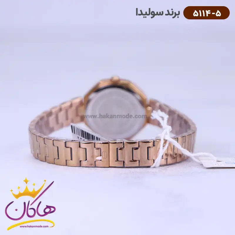 ساعت سولیدا زنانه رزگلد صفحه سورمه ای 5114/5 ظاهری کلاسیک و جذاب دارد. اصلی‌ترین چیزی که در ساعت زنانه سولیدا توجه ما را به خود جلب می‌کند، هم‌خوانی رنگ بند با قاب رزگلد ساعت است. قاب این ساعت چند ضلعی است. اگر به درون صفحه‌ی سورمه ای رنگ ساعت نگاه کنید، متوجه می‌شوید که اندکس‌های این ساعت به‌صورت نگینی و عقربه‌‌های آن رزگلد طراحی شده‌اند. نام برند solida زیر ساعت 12 دیده می‌شود. در کنار صفحه یک پیچ کوک برای تنظیم زمان وجود دارد. این ساعت بند استیل، رنگ ثابت و ضدحساسیت است. بند ساعت از یک بافت یکدست تشکیل شده و رزگلد رنگ است. این بند باعث تعرق و خارش نمی‌شود و قفل آن از مدل پروانه‌ای است که از دسته قفل‌های محکم و مطمئن است.