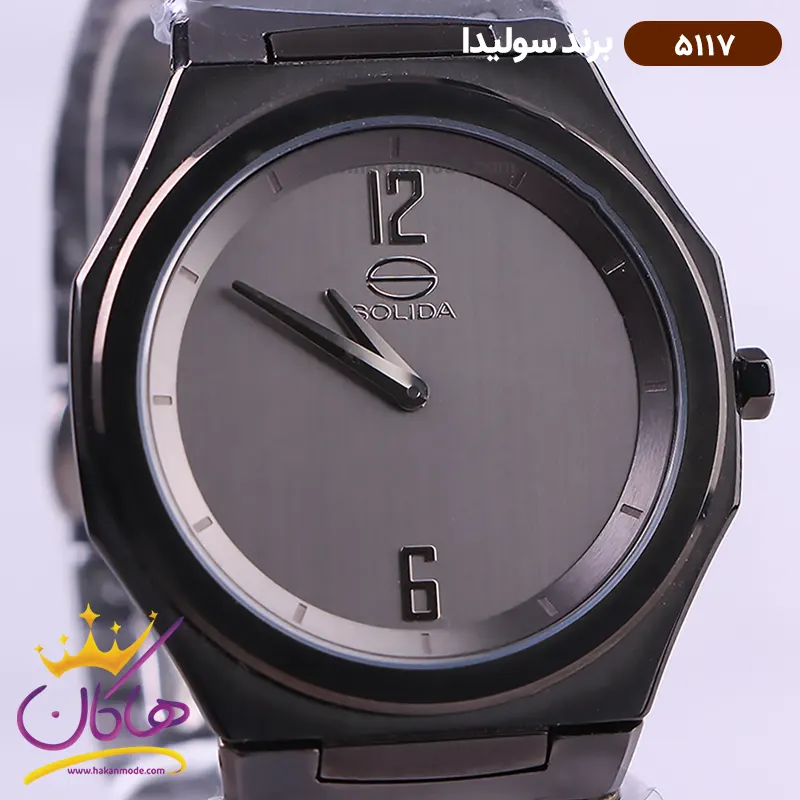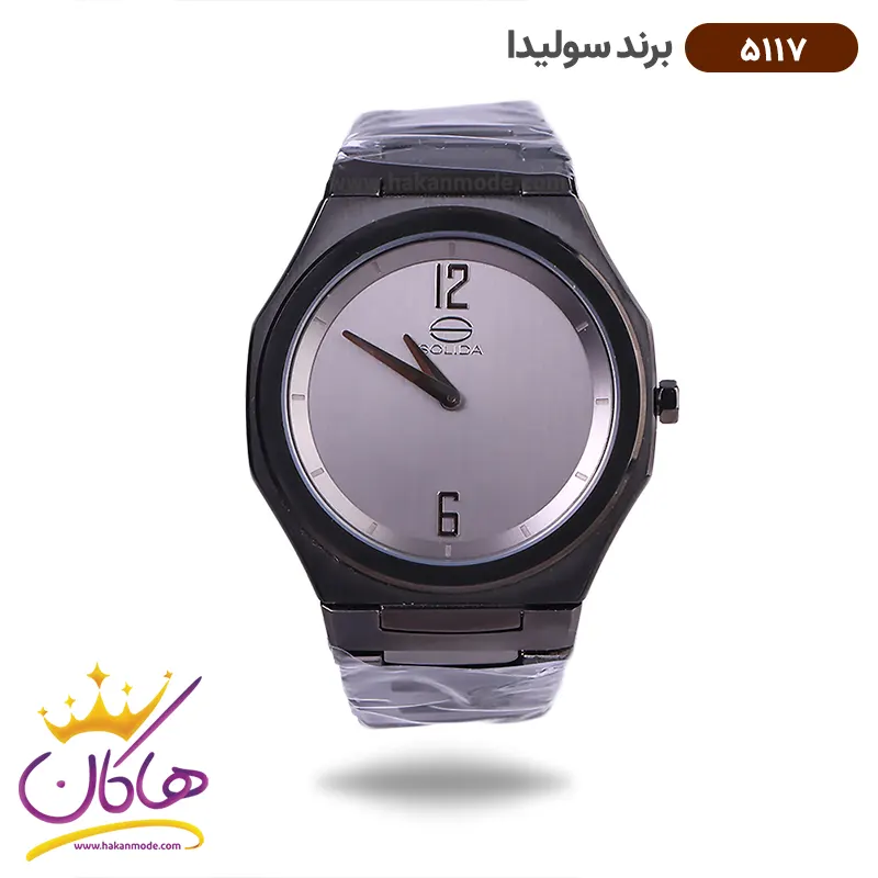 ساعت سولیدا مردانه فلزی 5117/1 ظاهری کلاسیک و جذاب دارد. اصلی‌ترین چیزی که در ساعت مردانه سولیدا توجه ما را به خود جلب می‌کند، هم‌خوانی رنگ بند با قاب مشکی ساعت است. اگر به درون صفحه‌ی خاکستری رنگ ساعت نگاه کنید، متوجه می‌شوید که اندکس‌های این ساعت به‌صورت خطی کوچک و فرورفته طراحی شده‌اند. فقط اندکس‌های موقعیت ساعت ۱۲ و ۶ به صورت عددی هستند. نام برند solida زیر ساعت 12 دیده می‌شود. در کنار صفحه یک پیچ کوک برای تنظیم زمان وجود دارد. این ساعت بند استیل، رنگ ثابت و ضدحساسیت است. بند ساعت از یک بافت ریز و درشت تشکیل شده و مشکی رنگ است. این بند باعث تعرق و خارش نمی‌شود و قفل آن از مدل پروانه‌ای دکمه‌دار است که از دسته قفل‌های محکم و مطمئن است.