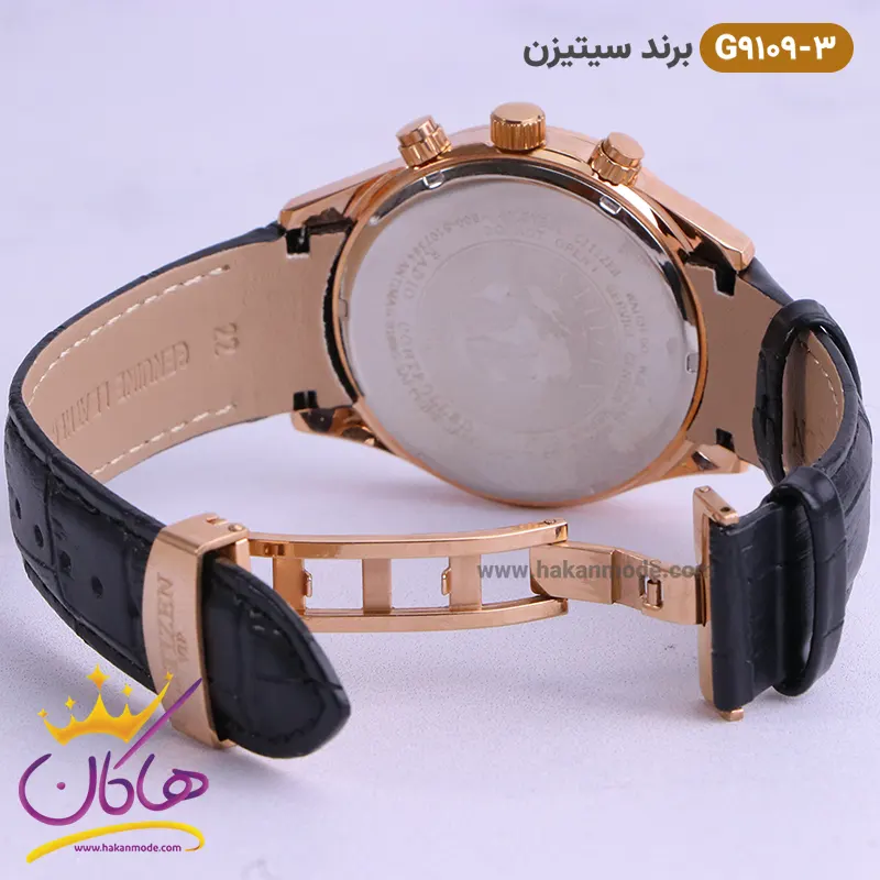 قفل ساعت سیتیزن مردانه بند چرمی مدل G9109 رزگلد