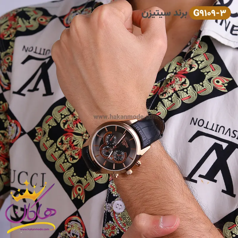 ساعت سیتیزن مردانه بند چرمی مدل G9109 رزگلد روی دست