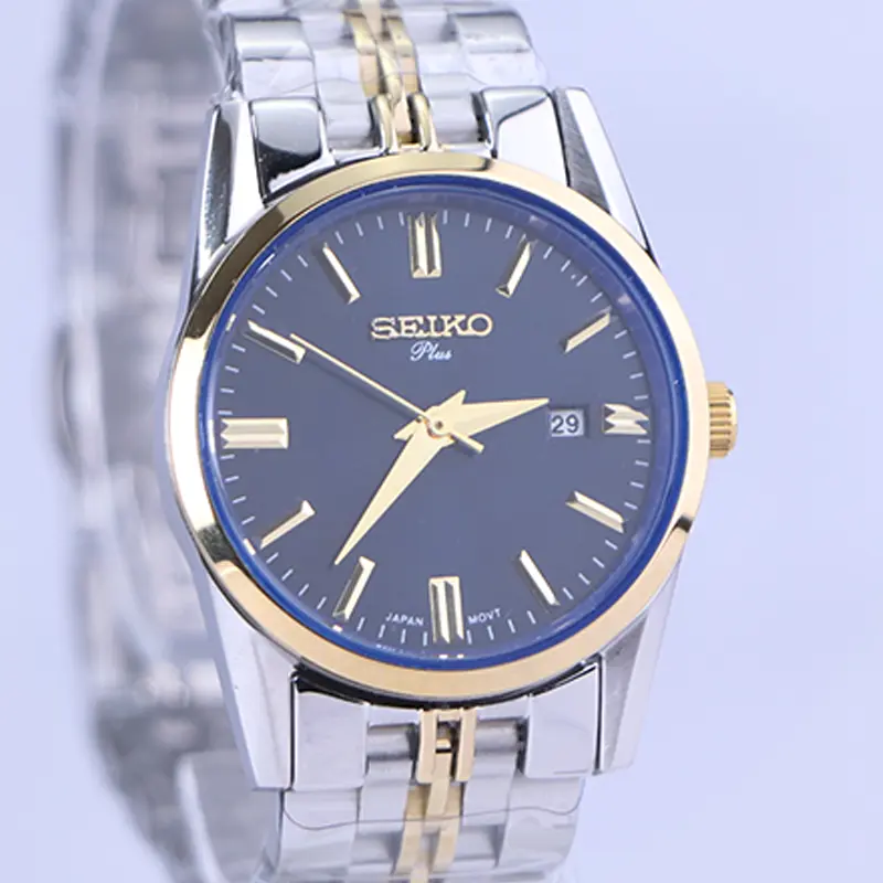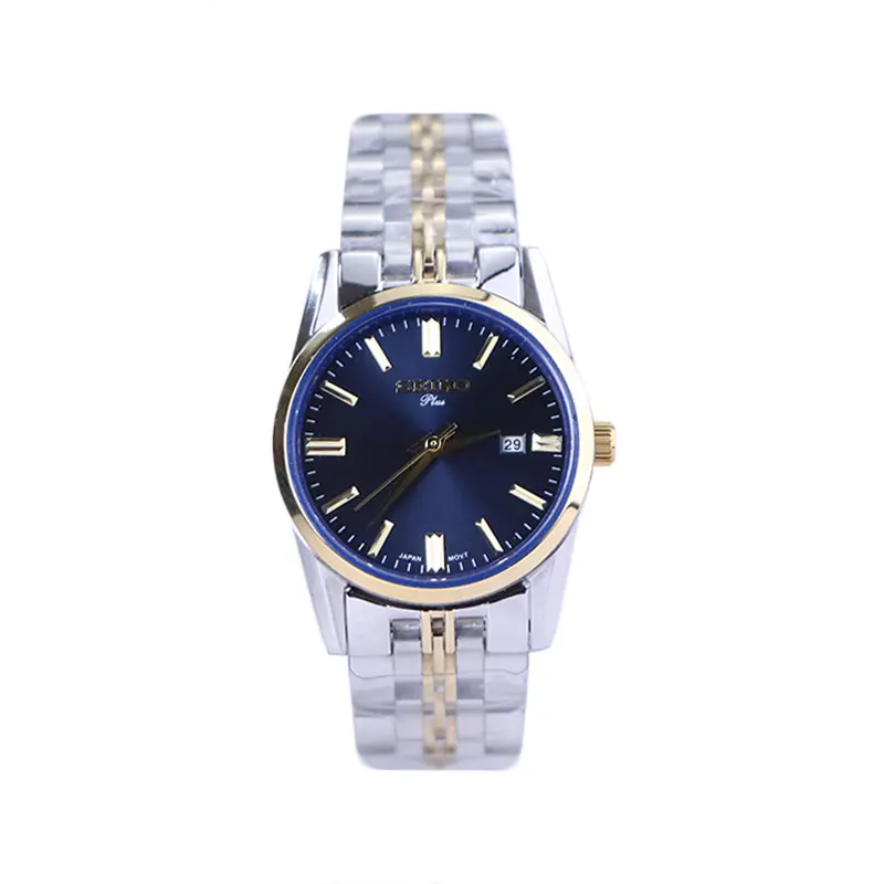 ساعت سیکو زنانه فلزی نقره‌ای طلایی ظاهری کلاسیک و جذاب دارد. اصلی‌ترین چیزی که در ساعت زنانه سیکو توجه ما را به خود جلب می‌کند، صفحه‌‌ی آبی رنگ ساعت است، اندکس‌های این ساعت خطی و طلایی و عقربه‌های آن طلایی هستند. در موقعیت عدد 3 مربع کوچکی وجود دارد که نشان‌دهنده‌ی تقویم ساعت است. نام برند seiko در زیر ساعت 12 دیده می‌شود. در کنار صفحه یک پیچ کوک برای تنظیم زمان وجود دارد. این ساعت بند استیل، رنگ ثابت و ضدحساسیت است. بند ساعت از یک بافت ریز و درشت تشکیل شده است که قسمت میانی طلایی و کناره‌های آن نقره‌ای رنگ است. این بند باعث تعرق و خارش نمی‌شود و قفل آن از مدل پروانه‌ای دکمه‌دار است که از دسته قفل‌های محکم و مطمئن است.