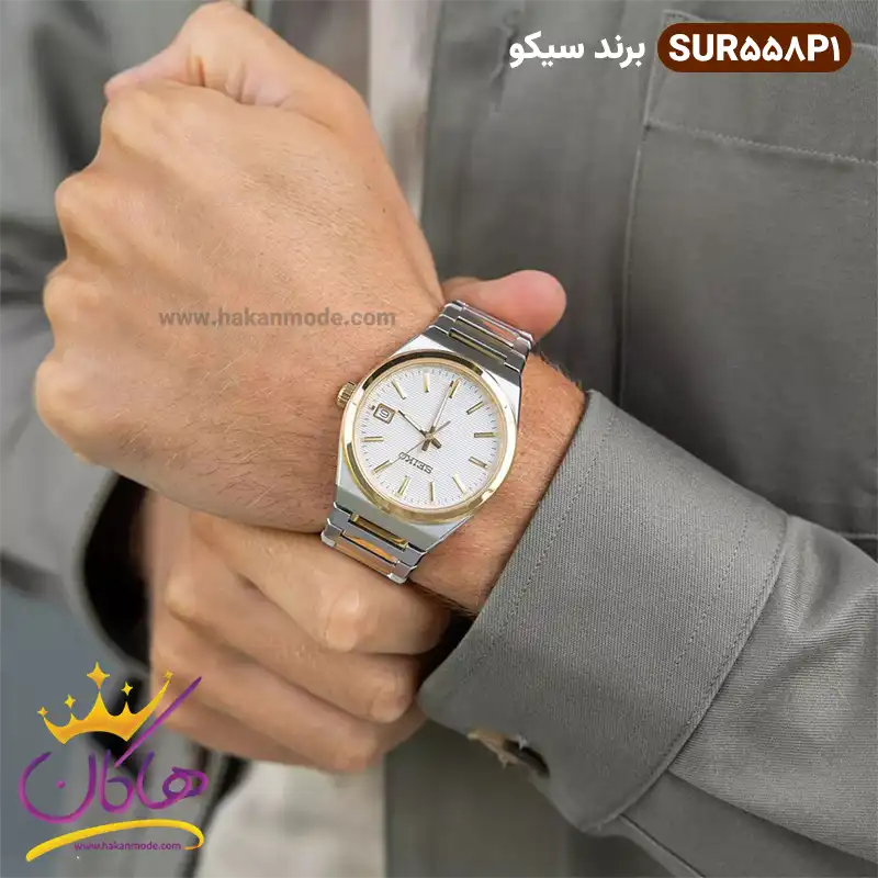 ساعت سیکو مردانه فلزی نقره ای طلایی SUR558P1 ظاهری کلاسیک و جذاب دارد. اصلیترین چیزی که در ساعت مردانه سیکو توجه ما را به خود جلب میکند، همخوانی رنگ بند با قاب طلایی ساعت است. اگر به درون صفحهی سفید رنگ ساعت نگاه کنید، اندکسهای این ساعت خطی و عقربهها شبنما هستند. در موقعیت عدد 3 مربع کوچکی وجود دارد که نشاندهندهی تقویم ساعت است. نام برند seiko در زیر ساعت 12 دیده میشود. در کنار صفحه یک پیچ کوک برای تنظیم زمان وجود دارد. این ساعت بند استیل، رنگ ثابت و ضدحساسیت است. بند ساعت از یک بافت ریز و درشت تشکیل شده است که نقره ای طلایی است. این بند باعث تعرق و خارش نمیشود و قفل آن از مدل سهتکه دکمهدار است که از دسته قفلهای محکم و مطمئن است.