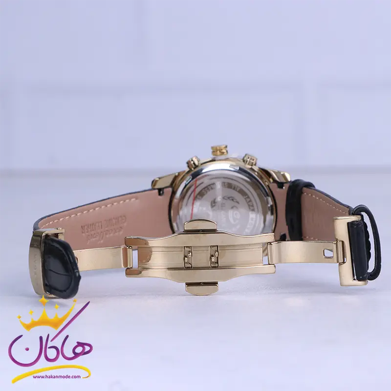 ساعت عقربه ای الگانس زنانه بند چرم قاب طلایی L2127/14 نمای باز قفل
